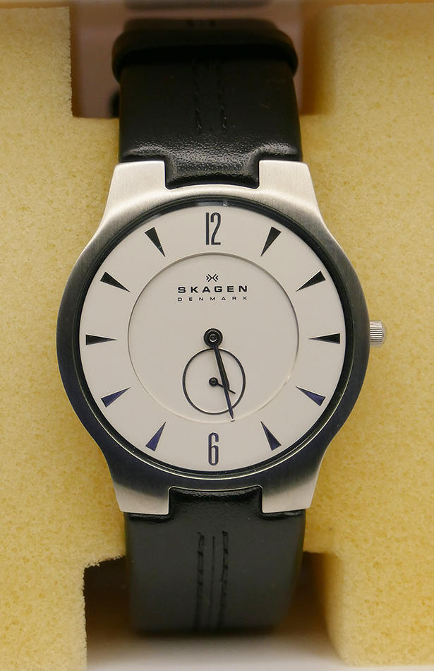 Skagen Denmark Men's Wristwatch. Stainless Steel Case with Leather Strap. Water Resistant. Comes with the original plastic box. In Very Good Condition with a clean face and a couple scratches on the back.