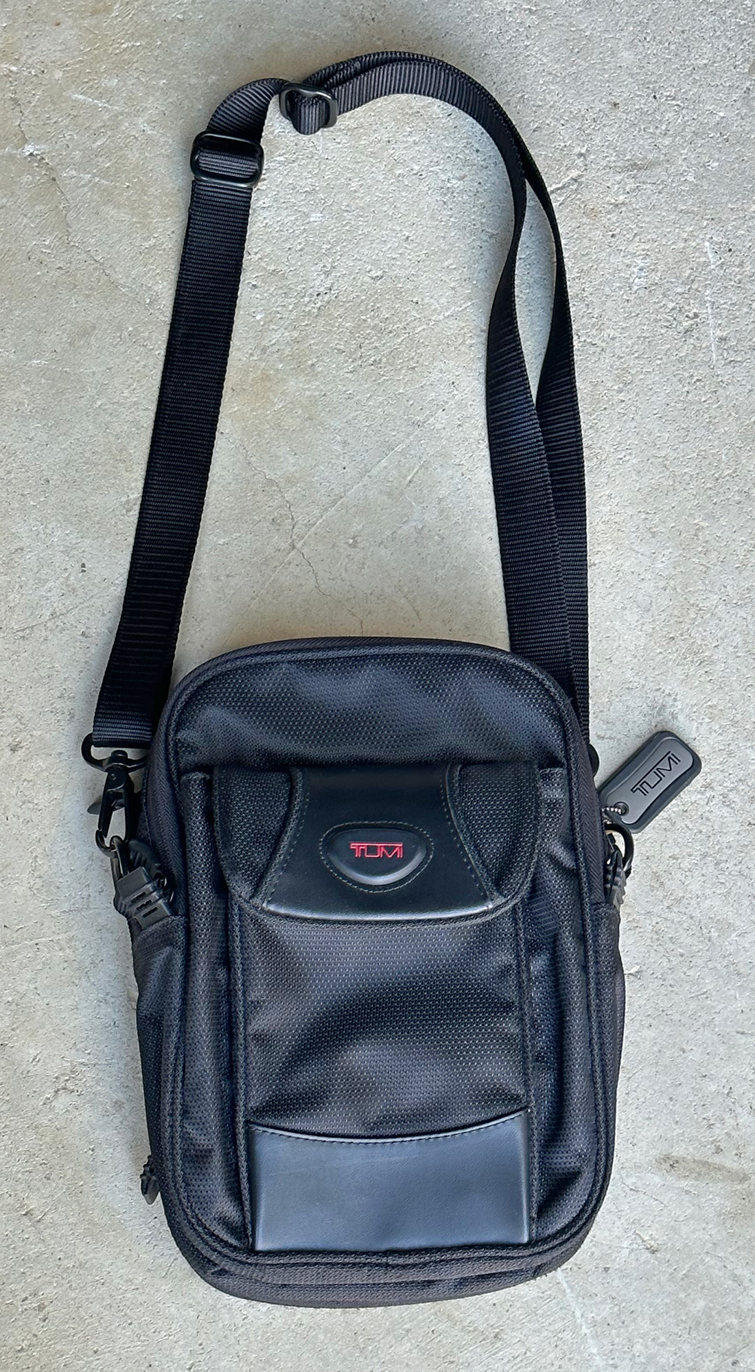 Small Tumi Crossbody Bag. In Ballistic Nylon and Leather. Body Size: 10" x 7". In Very Good Condition.
