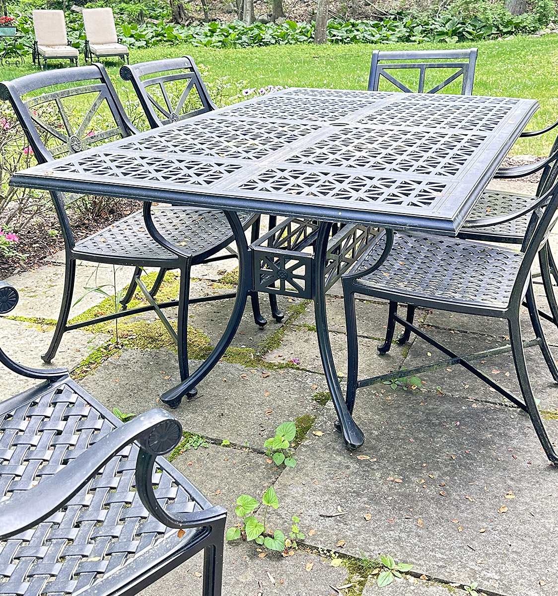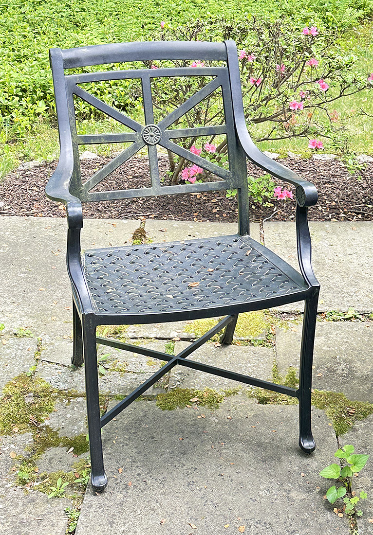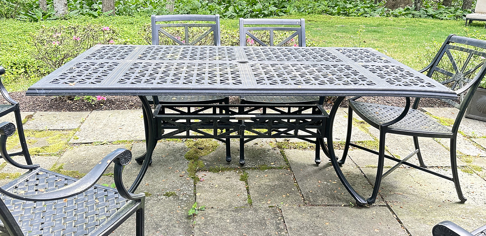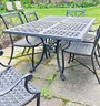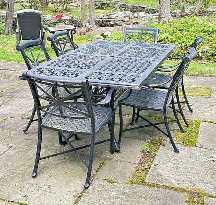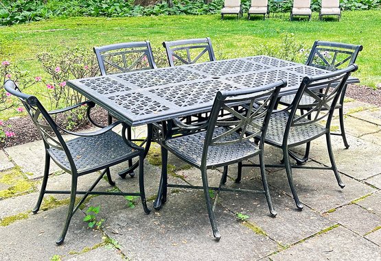 Smith & Hawken Aluminum Outdoor Dinning Set. Includes a 72" x 42" Dining Table And 6 Chairs. In Black. In good condition with some light paint peeling on the table base. Measurements: 42" x 72" x 29.5"h (table), 24" x 27" x 35"h (chair).