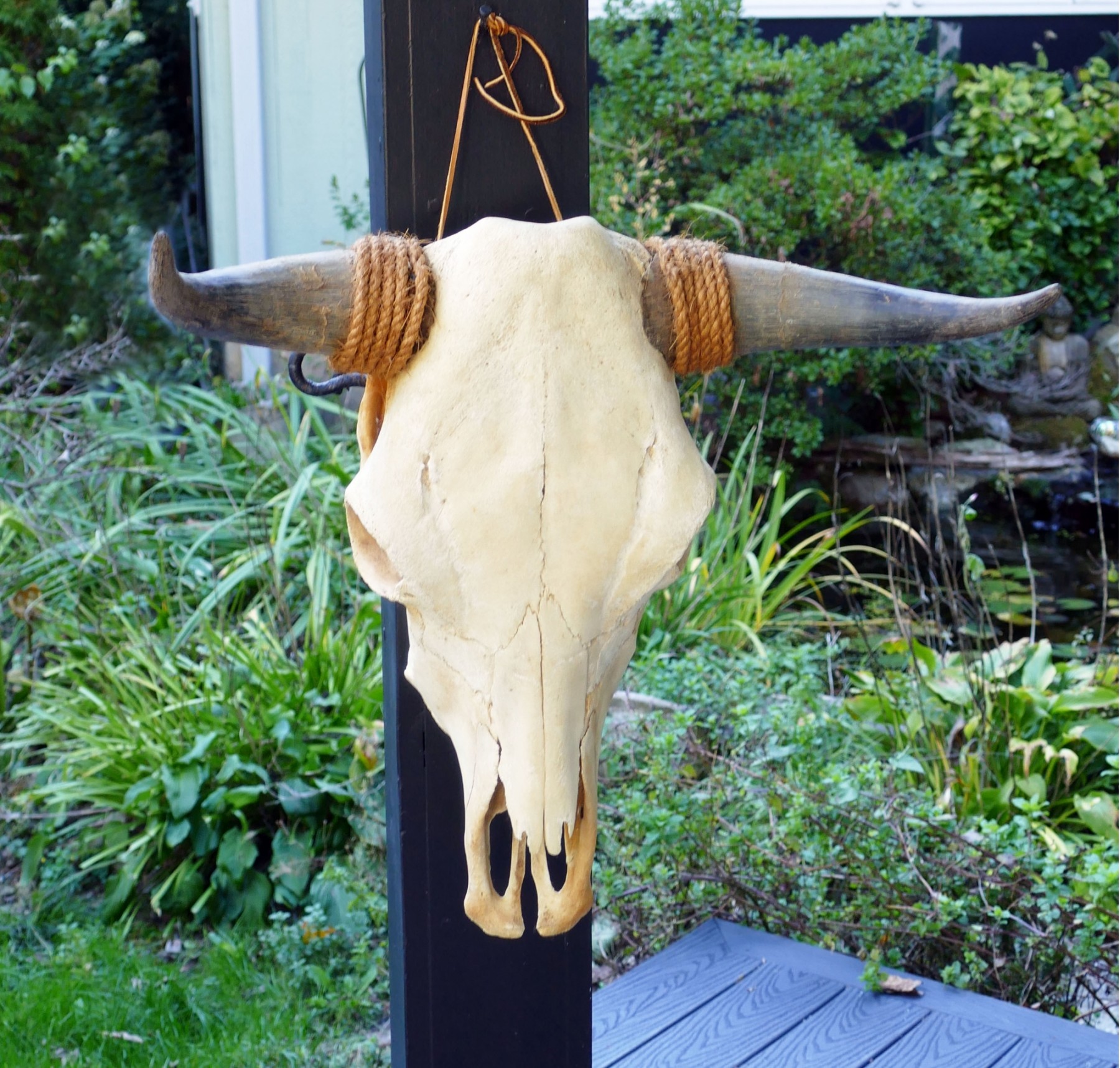 Steer Skull With Horns. Includes a leather cord attached for hanging. In Very Good Condition.