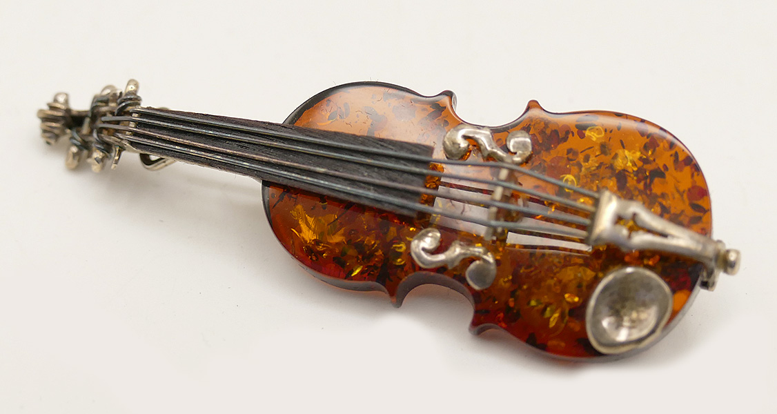 Sterling Silver & Amber Violin Brooch / Pin. 2.5" x .75". In Very Good Condition.