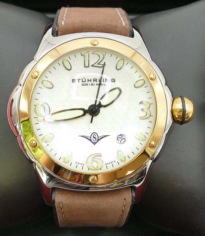 Stuhrling Stainless Steel Wristwatch w/ Leather Band. Never Worn - In New Cosmetic Condition. Still has the tag attached and the factory plastic on the face and band. Untested.