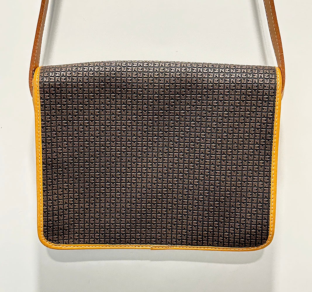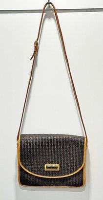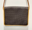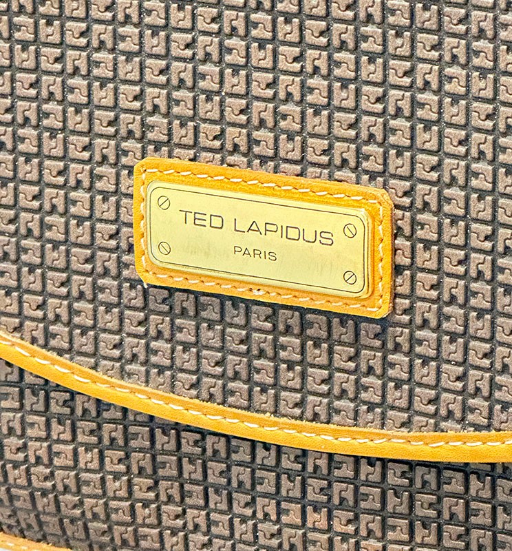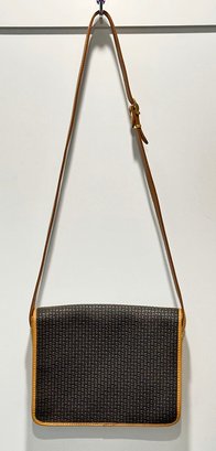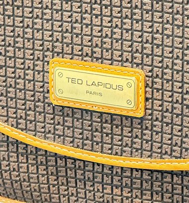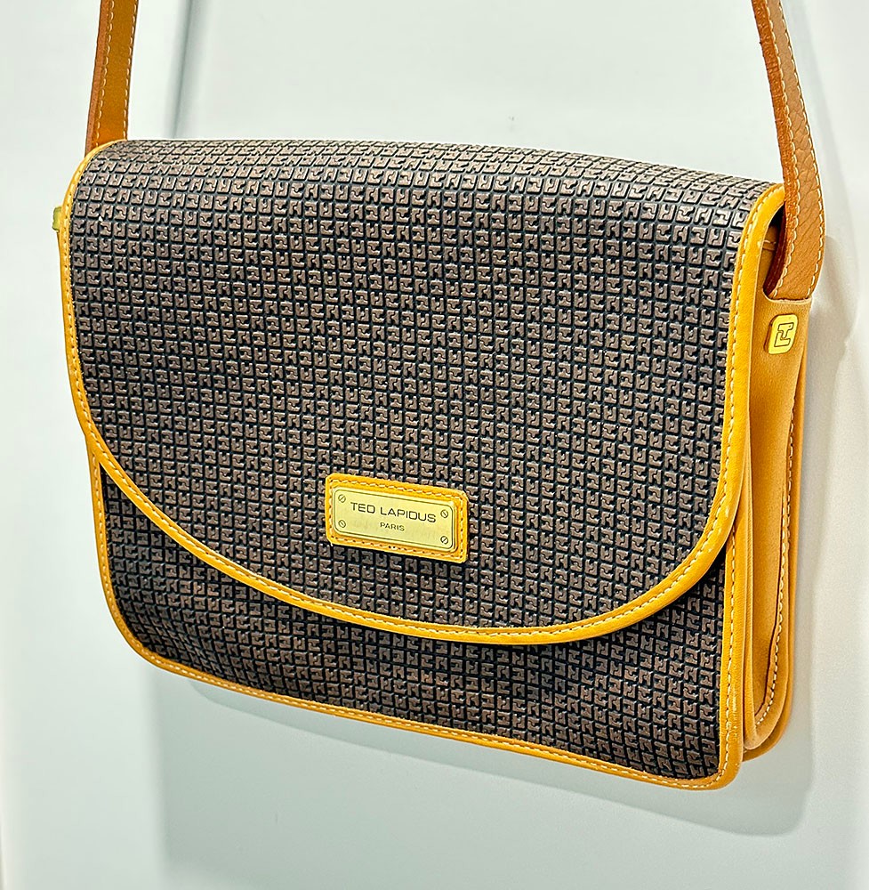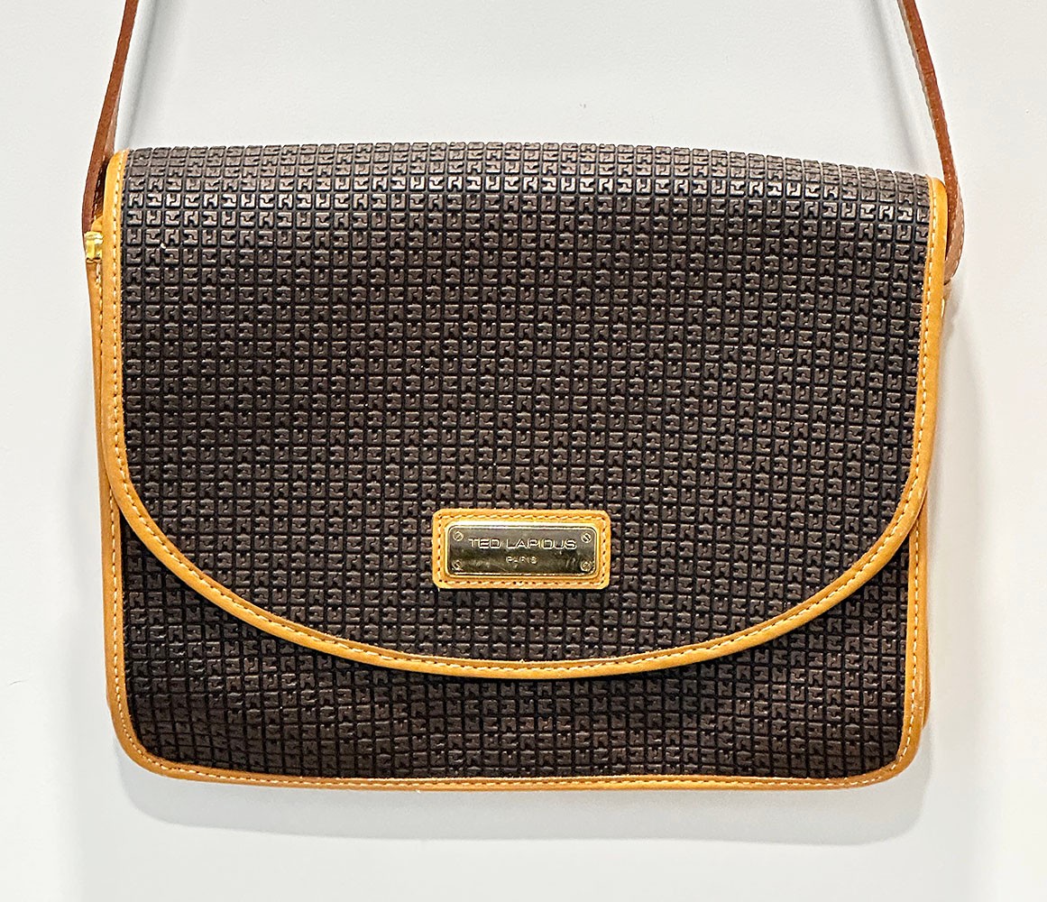 Ted Lapidus Leather Embossed Crossbody Bag. Made in France. In Excellent Condition. Great Example. 10.25" x 3" x 8"h (bag), 20" drop.