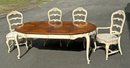 Thomasville French Provincial Style Dining Table & 4 Chairs. The table has 2 - 19" leaves which extend it from 44" x 44" x 30"h up to 82" x 44" x 30"h. Includes 4 Chairs (2 with arms). The table is in good condition; the chair frames are good, 2 need upholstery.