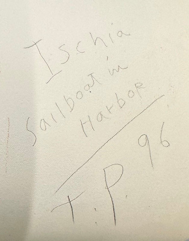 Tony Palladino (1930 - 2014) Original Painting "Ischia: Sailboat In Harbor" (1996). Oil On Paper. Signed l/r and signed, titled, and dated in pencil on back. Unframed; In very good condition. Paper Size: 27.5" x 40"