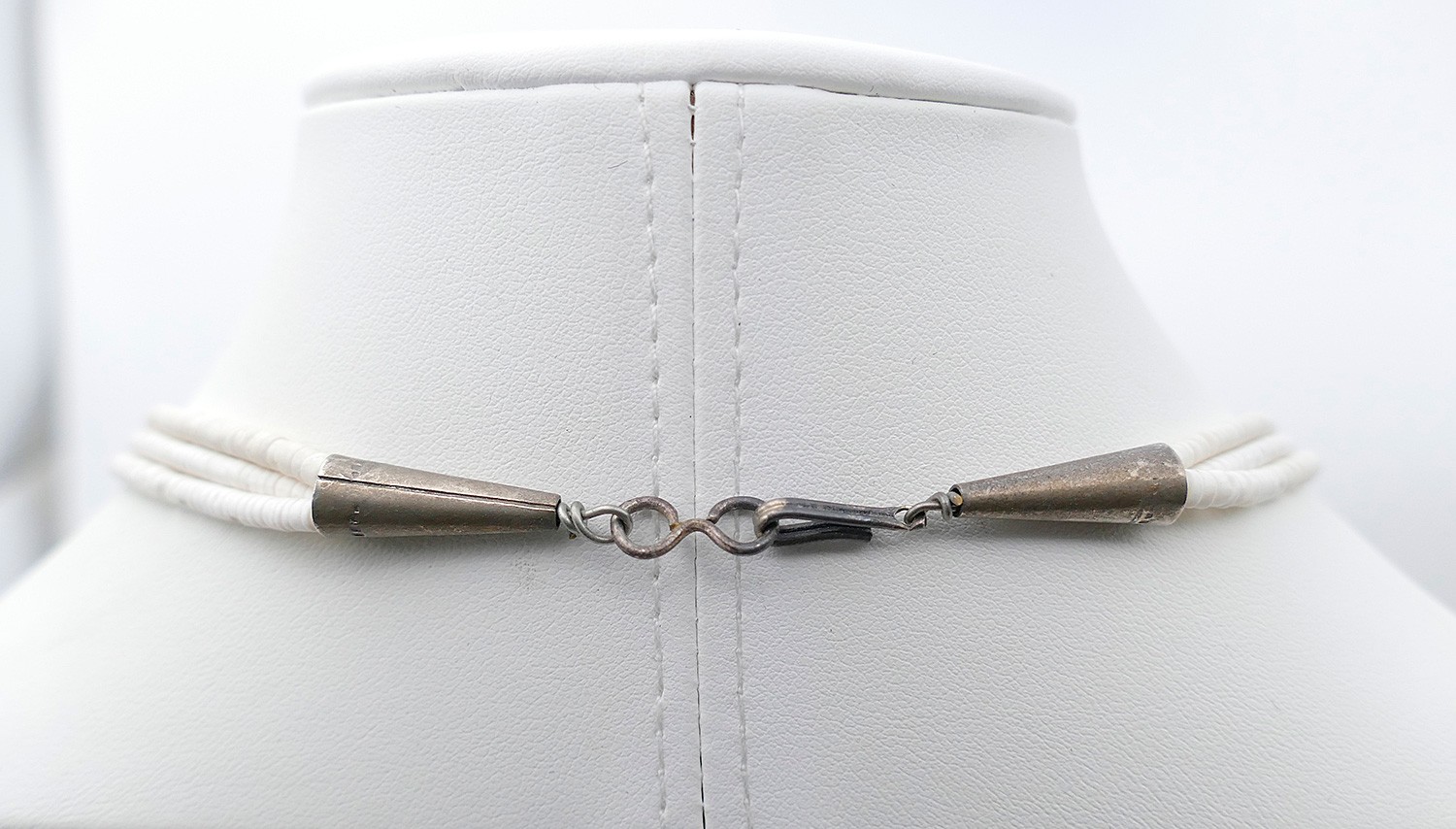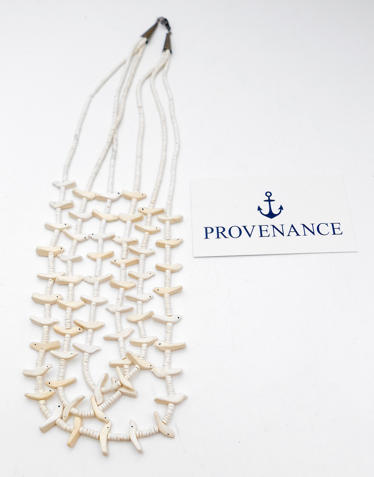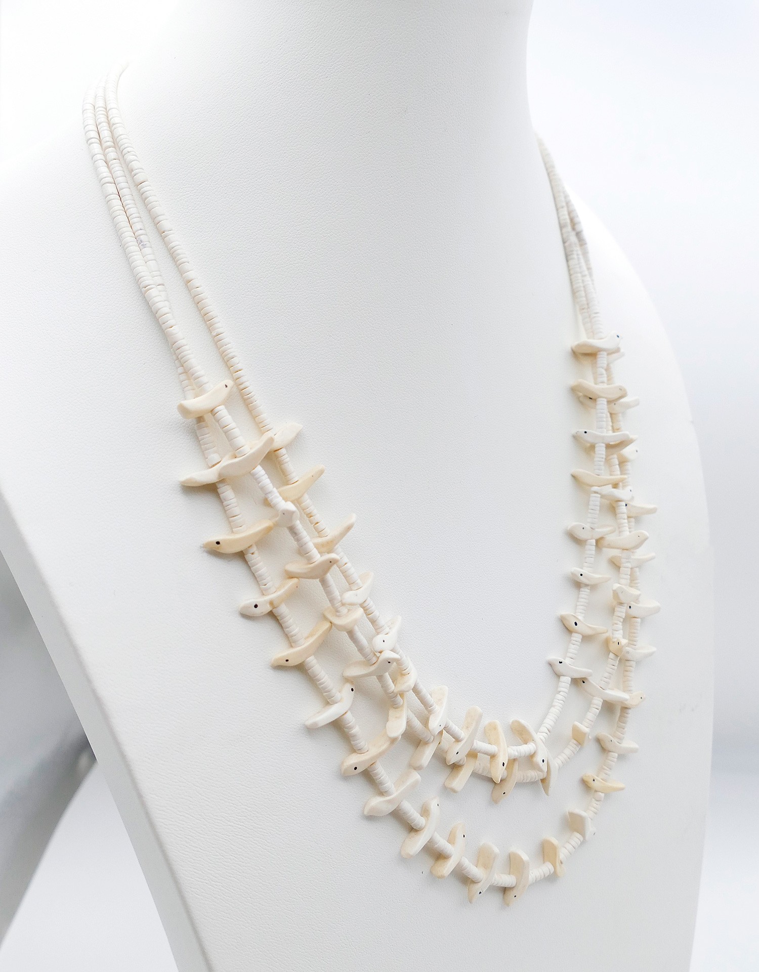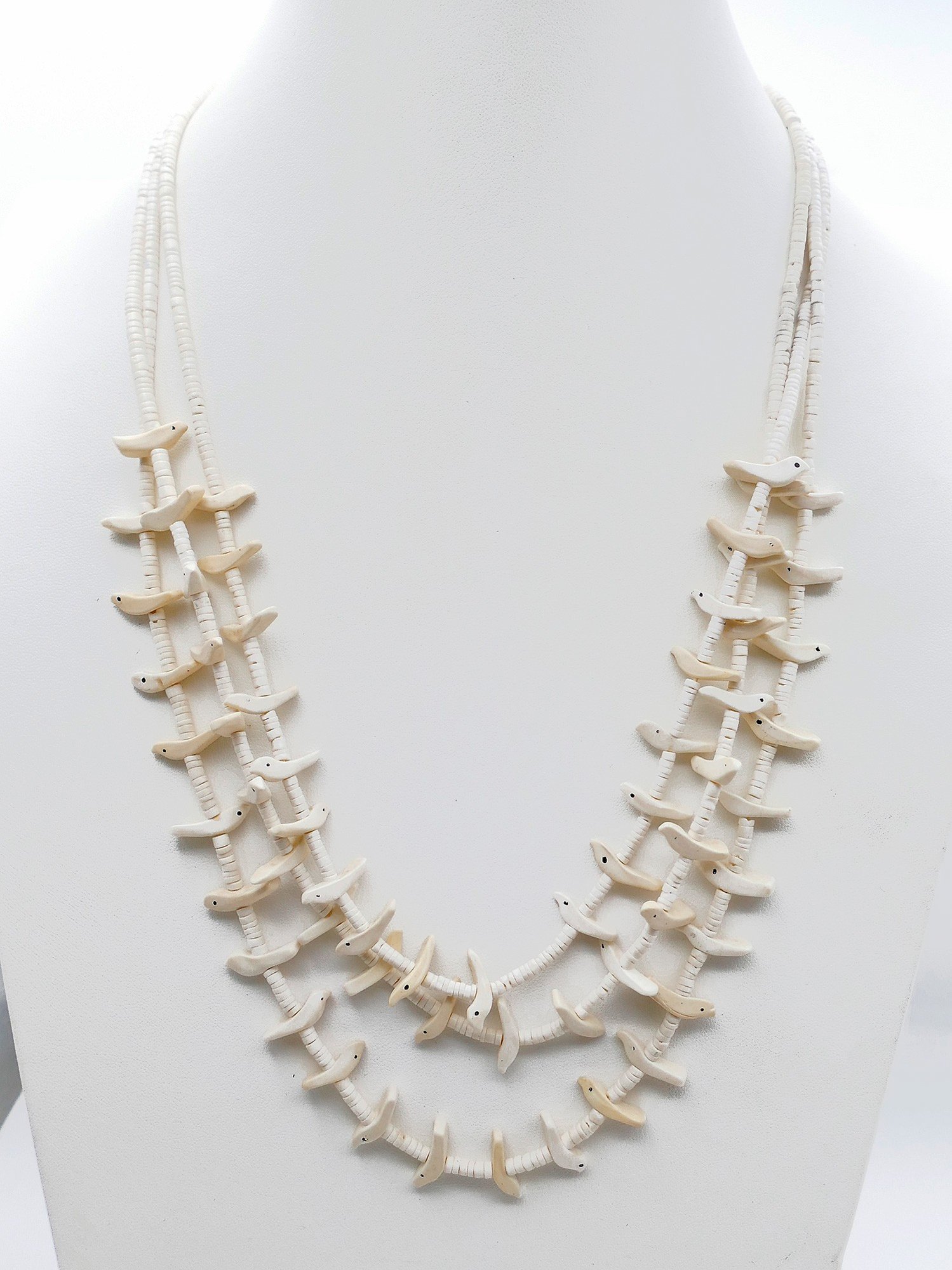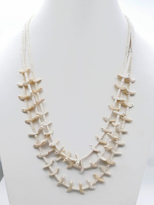 Triple Strand Native American Zuni Bird Fetish Necklace. Clam shell with silver clasp. In Very Good Condition. 23" Long.