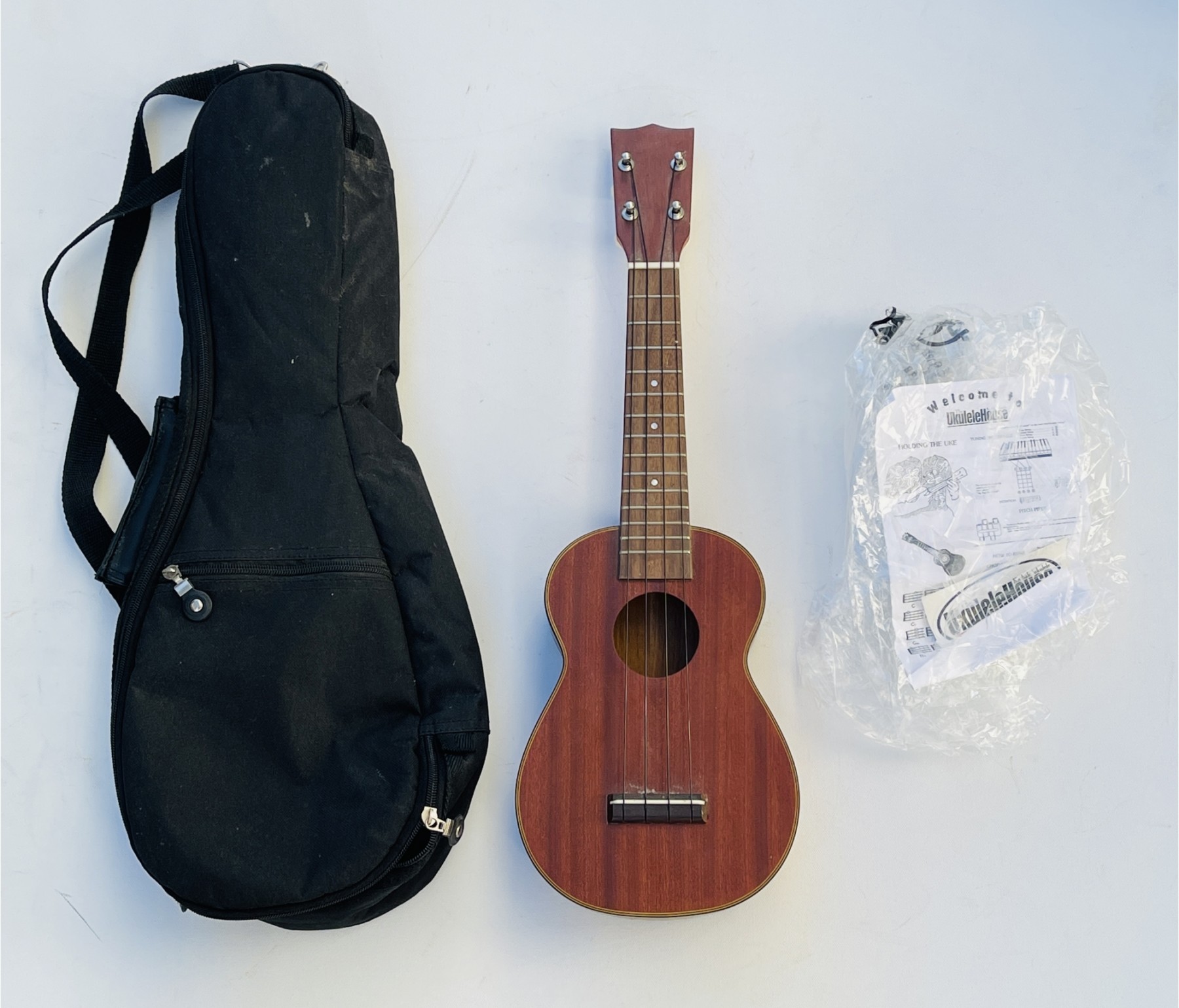 Ukulele With Soft Case. Purchased from Ukelele House. In very good condition and appears rarely, if ever used. 21" Tall, 7" Wide.