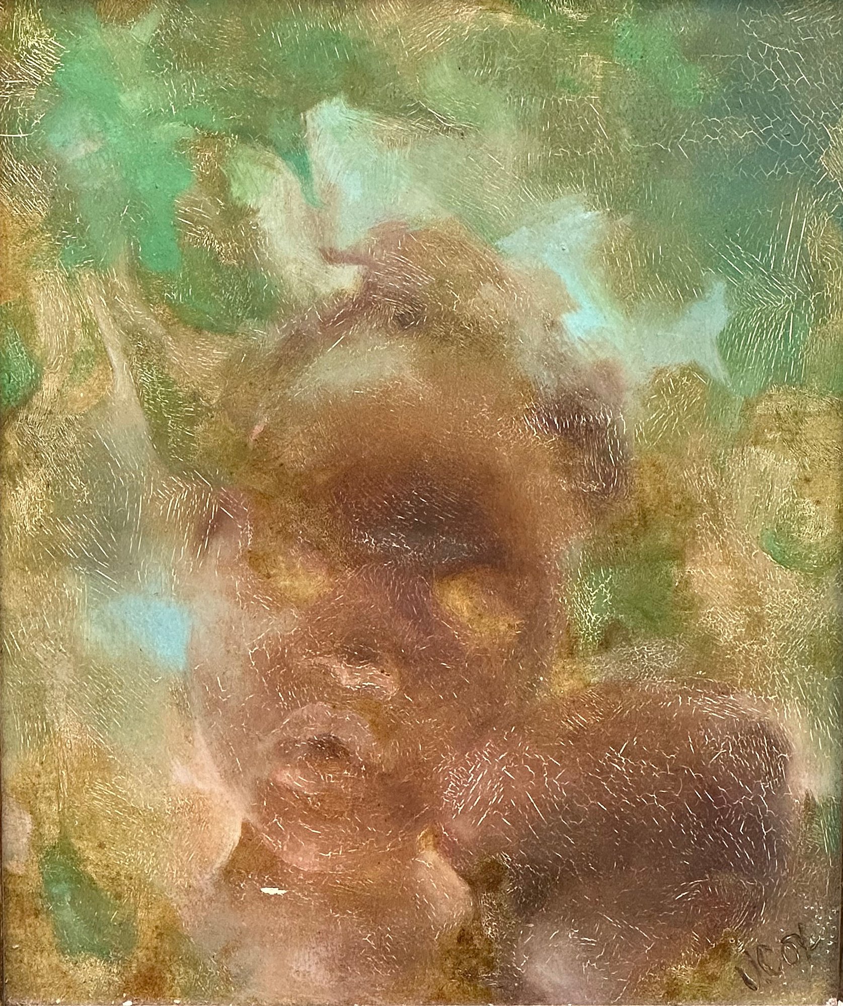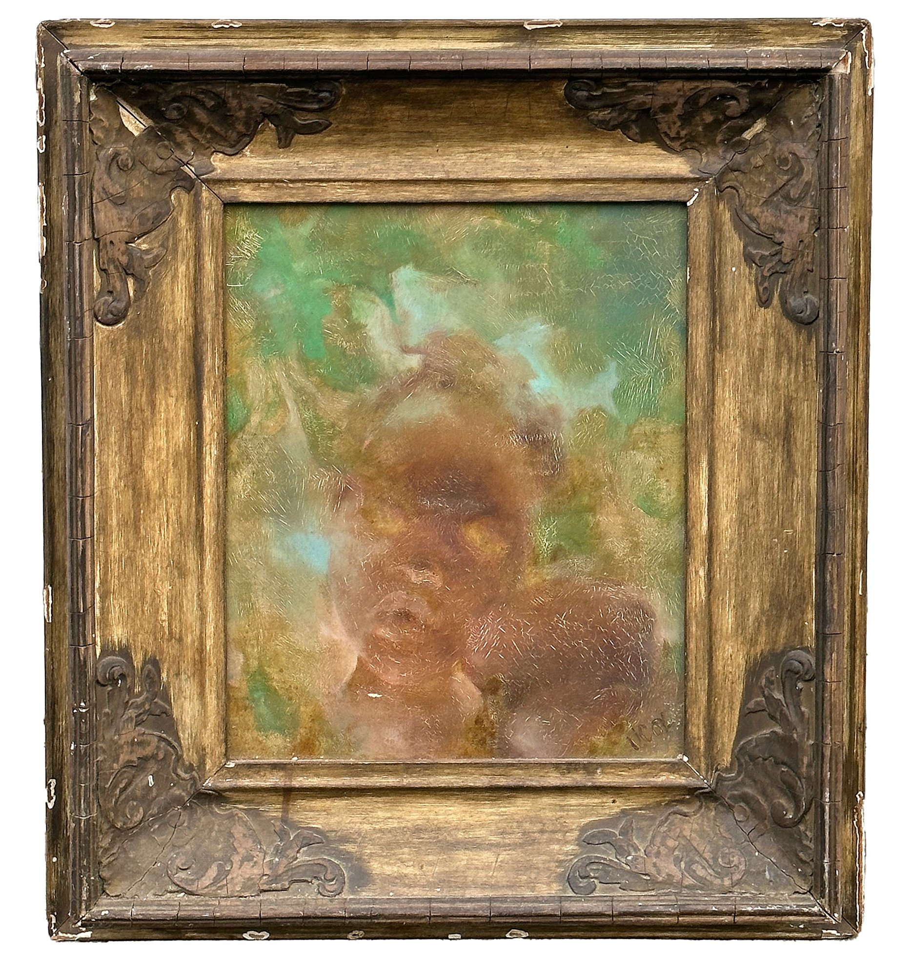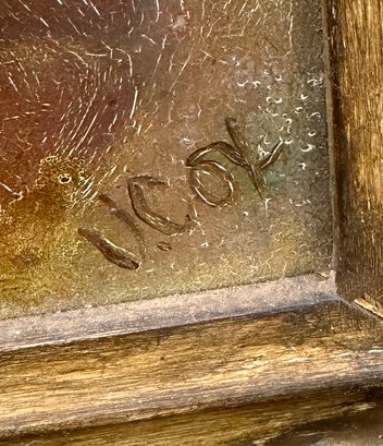 V. Cox Original Oil On Masonite Painting. In a vintage wood and plaster frame. The painting has some cracking and the frame has wear and tear. Framed Measurements: 18.375" x 21"