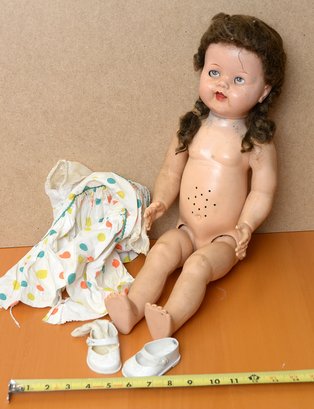 Vintage 1950's Ideal Saucy Walker Doll. 22" Tall. With a clothes outfit and shoes. Some dirt, wear and tear.