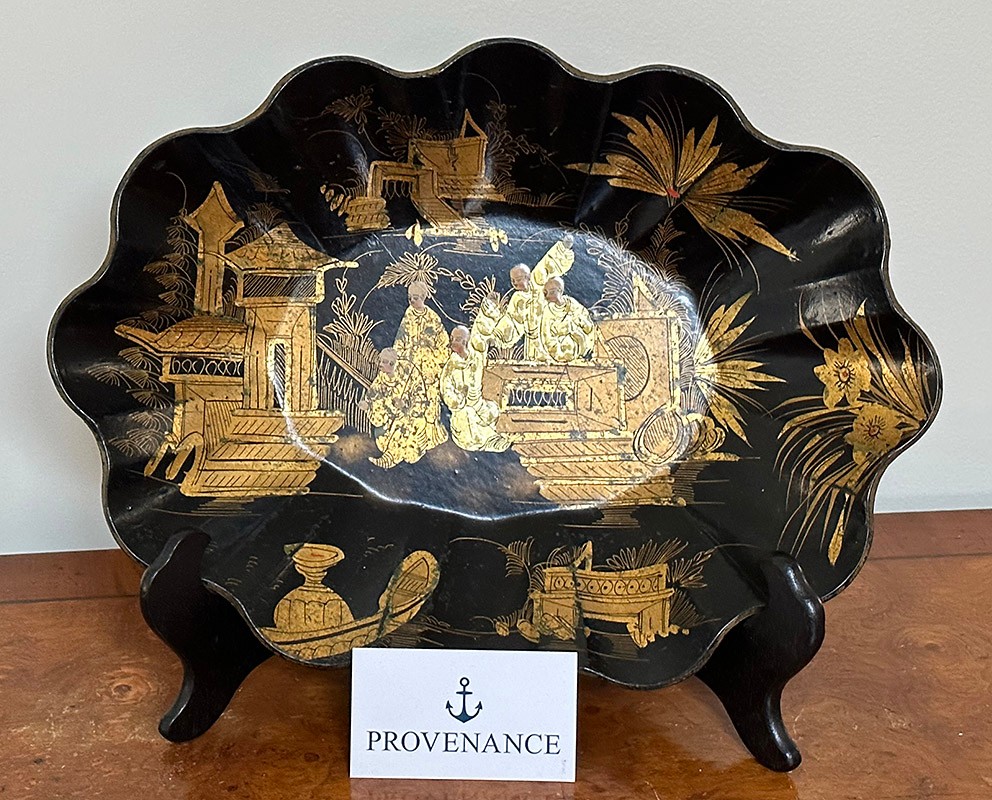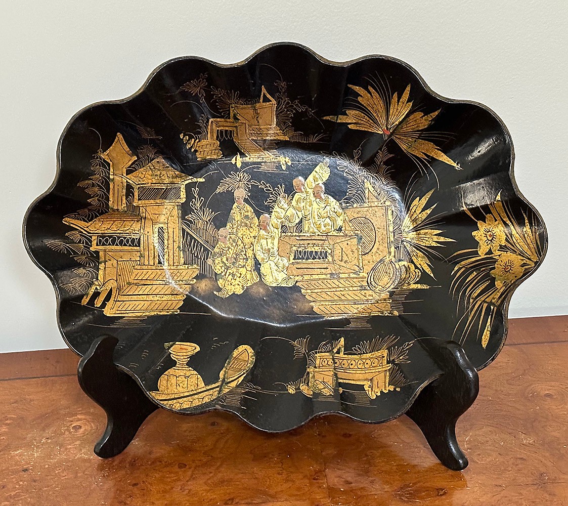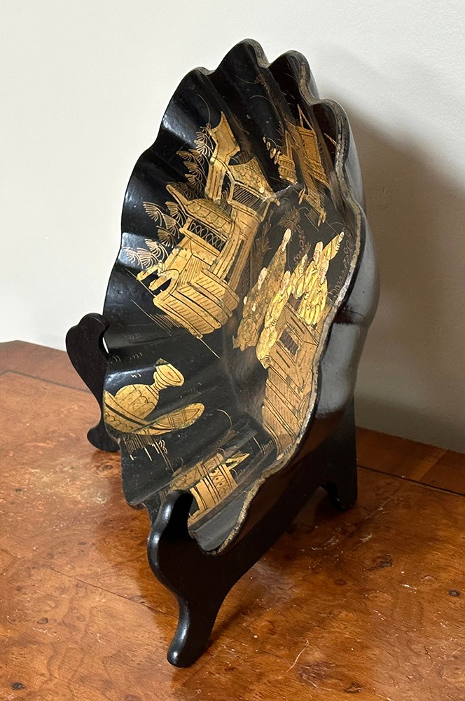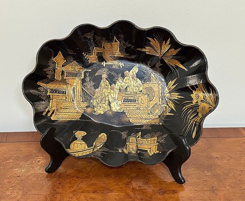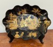 Vintage Asian Chinoiserie Papier Mache Scallop Bowl. In good condition. Stand not included. 10.5" x 14.25"