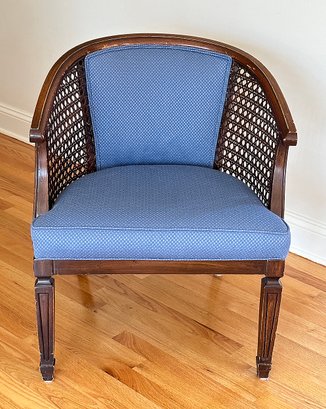Vintage Cane Barrel Chair. Nicely upholstered. 25.5" x 22" x 29"h.