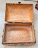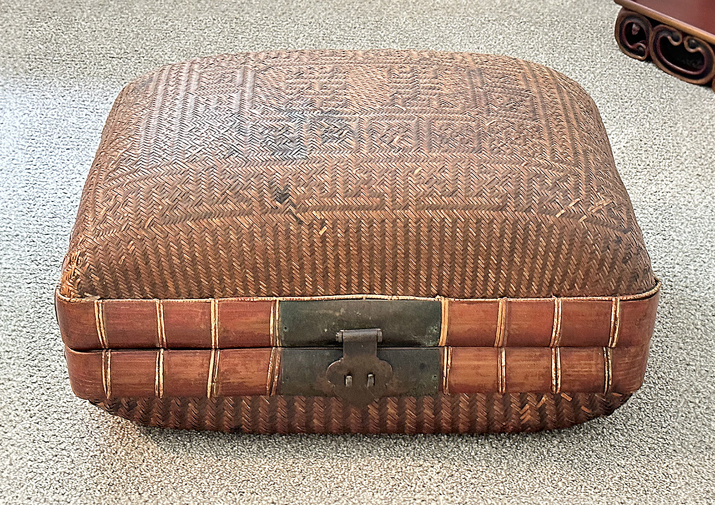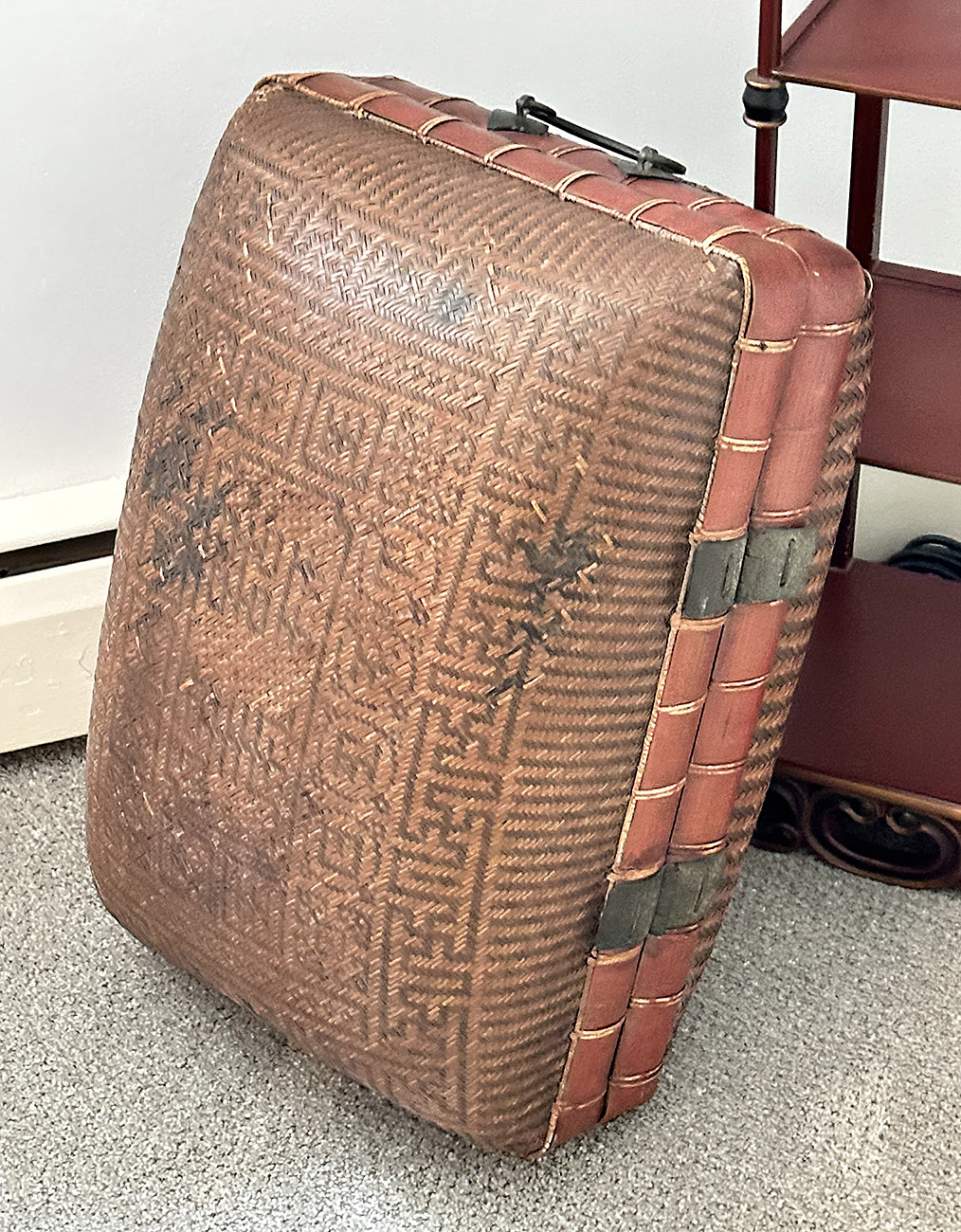 Vintage Chinese Woven Rattan and Bamboo Pillow Basket. Geometric woven design. In Good Condition. 26" x 11" x 16".