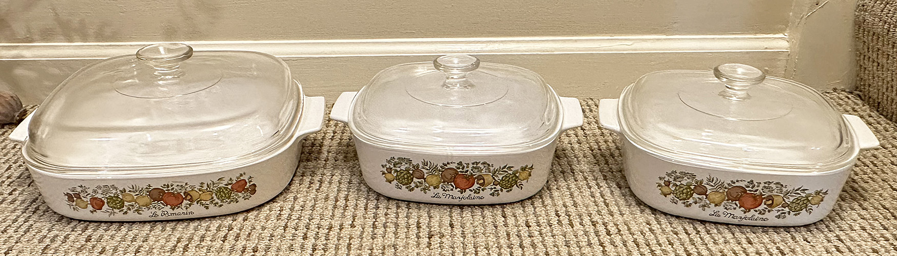 Vintage Corning Ware La Marjolaine Bakeware / Casseroles. 6 Piece Set. The glass top to the 10 x 10 x 2 casserole has a chip on the handle; the casserole itself as well as the other pieces are in very good condition.