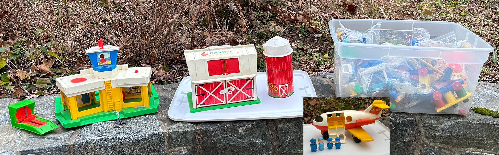 Vintage Fisher-Price Sets & Various Accessories. Includes a Farm and Airport. From the 1980's. Includes figures, animals, farm equipment, and other accessories.