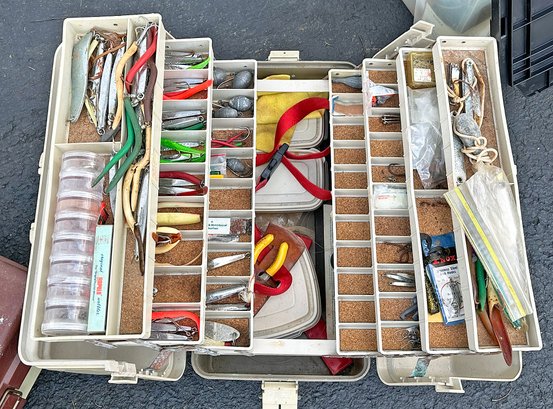 Vintage Fishing Tackle Box - Lures , Weights, Etc. Box has the owners name on it.