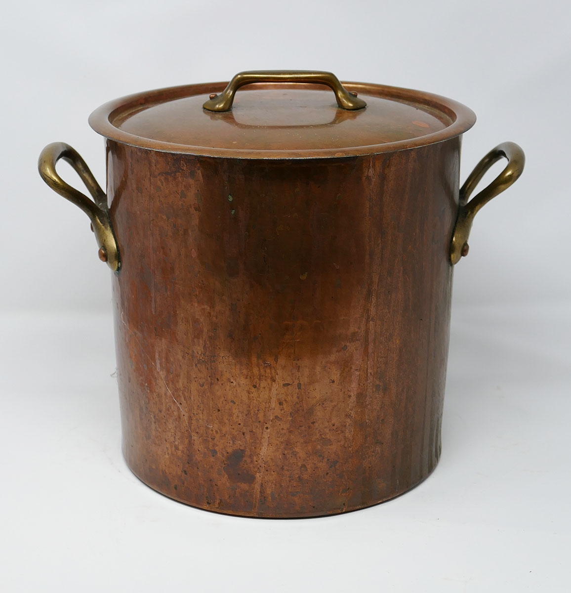 Vintage French Hammered Copper Stockpot. 11"h, 9.5" diameter (12" wide with handles). Interior has wear from use.