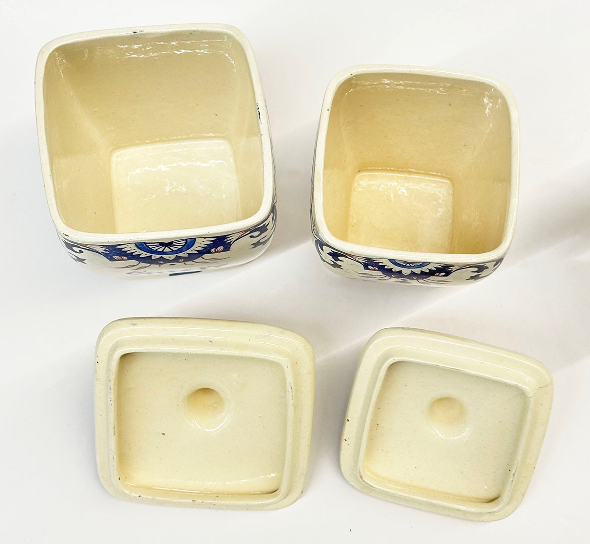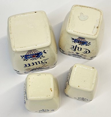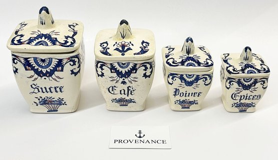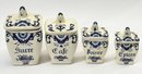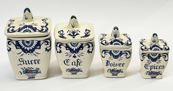 Vintage French Kitchen Counter Ironstone Canister Set - Sugar, Coffee, Pepper, and Spices. 4.5" to 6.5" Tall. In good overall condition with a couple areas of light cracking.