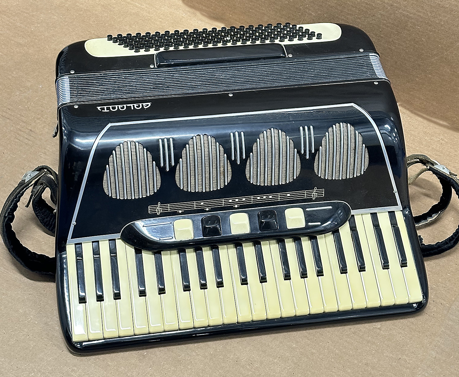 Vintage Galanti HFM-83 Piano Accordion. Made in Italy. With Hard Case. The bellows appear to be in good condition and it appears to operate properly but we didn't test all the buttons, switches, and keys.