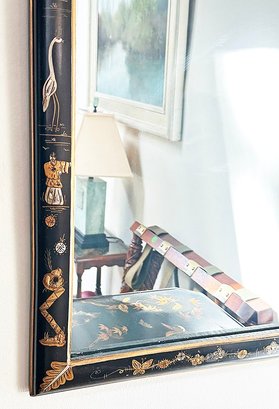 Vintage Hand-Painted Black Lacquer And Gold Chinoiserie Mirror. In Very Good/Excellent Condition. 20.5" x 36"h.