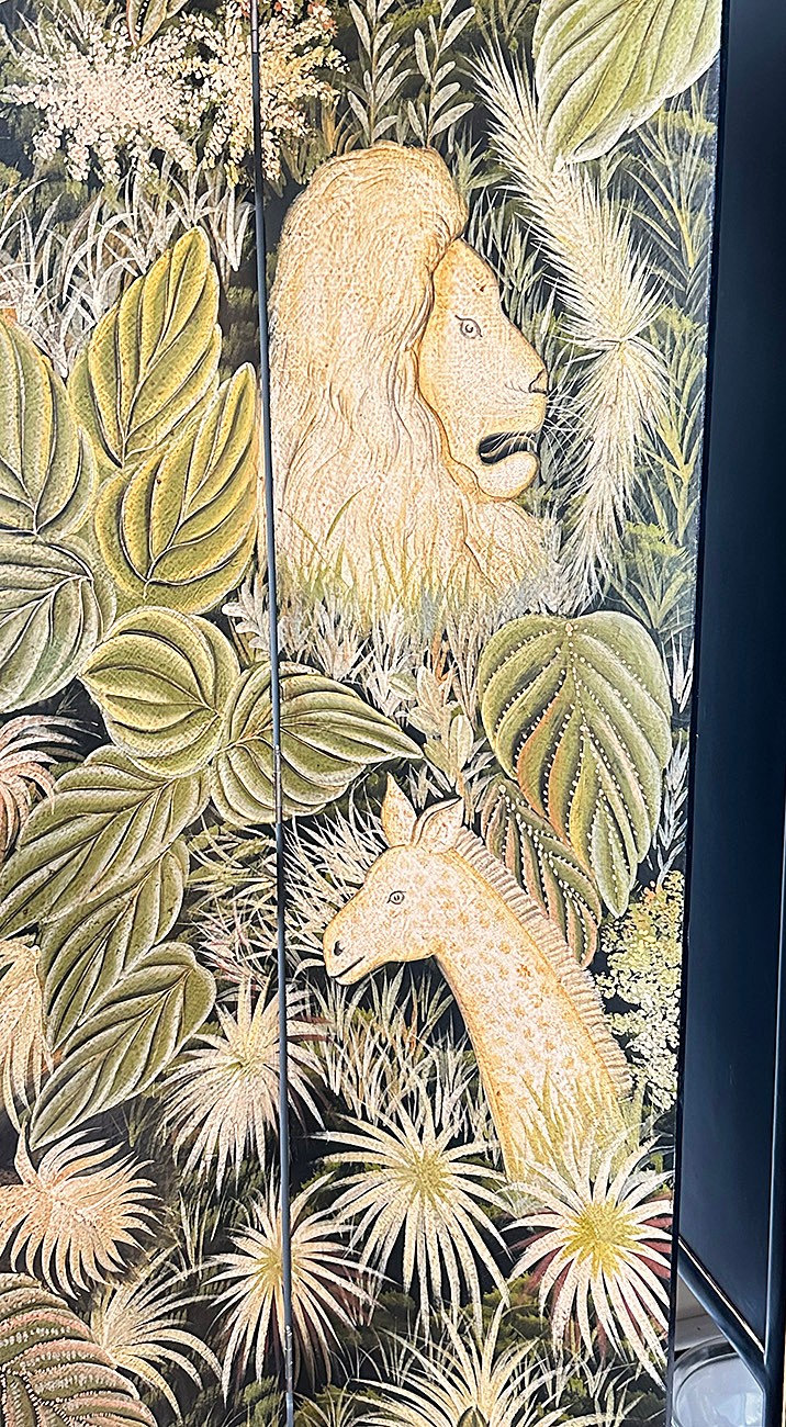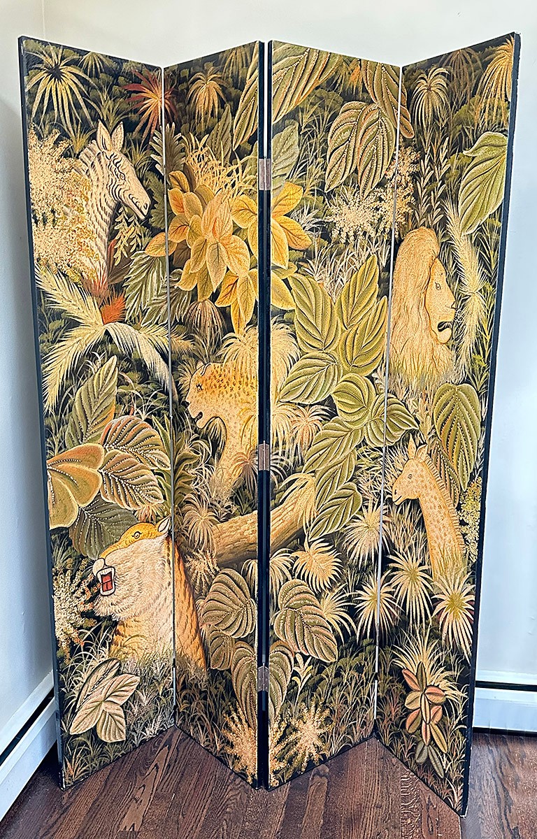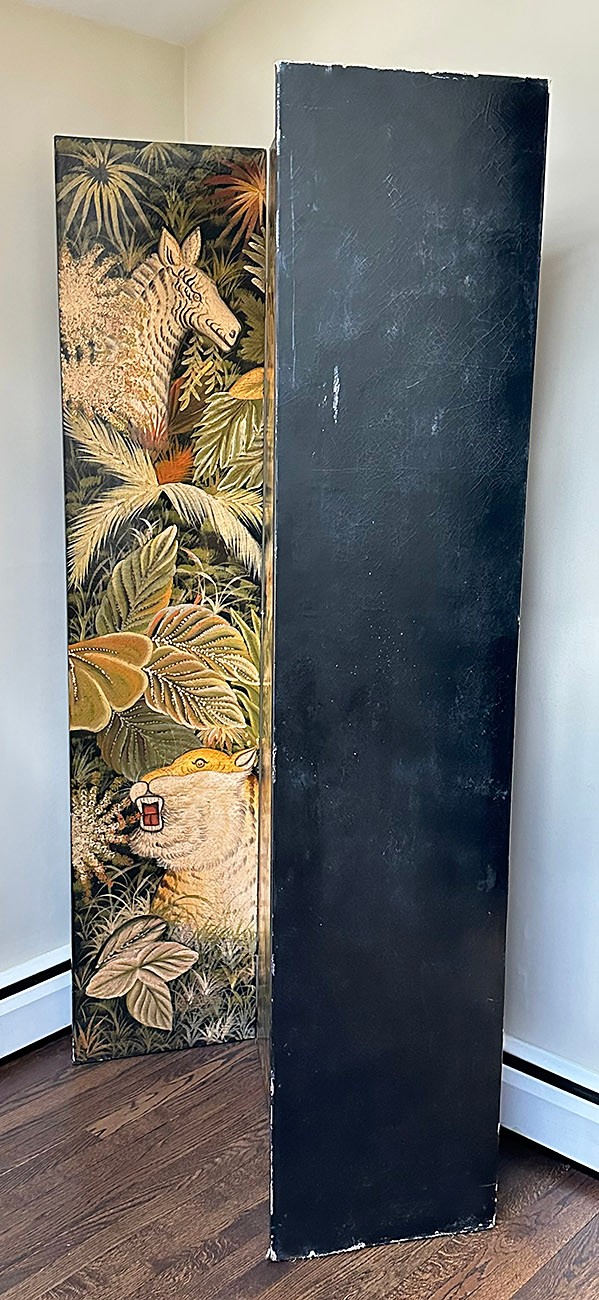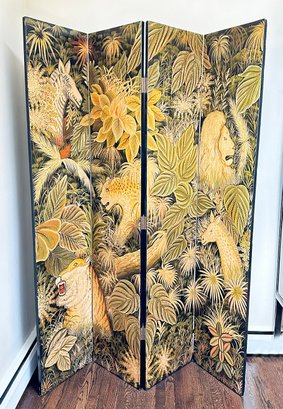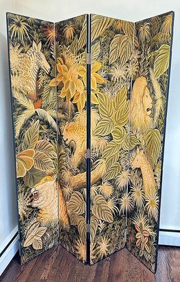 Vintage Hand-Painted Jungle Scene 4 Panel Screen. Solid black back. In good condition with some cracking on the black side. The painted side is in Very Good condition. Each panel is 18" wide and 84" tall. Total measurements: 72"w x 84"h