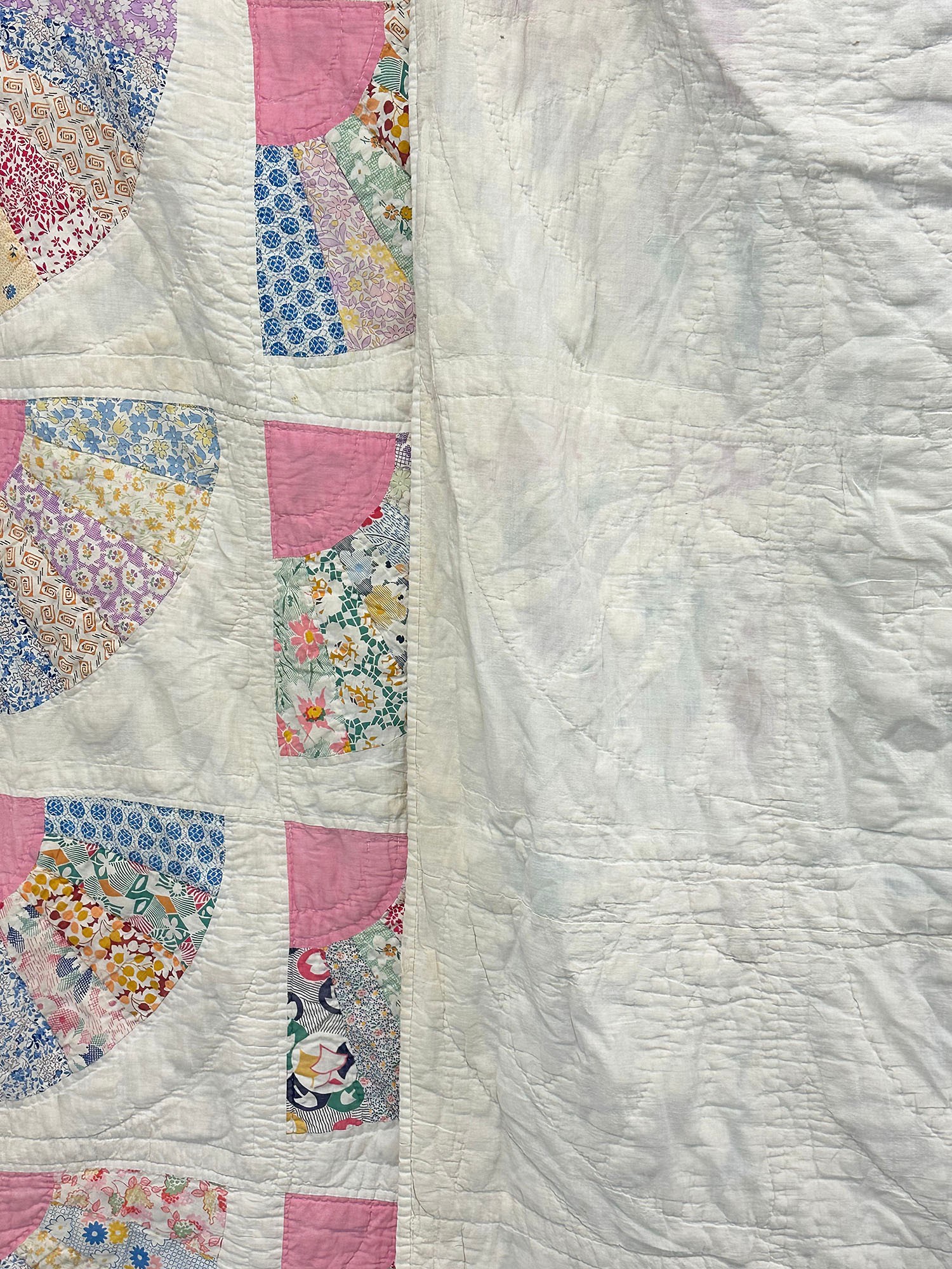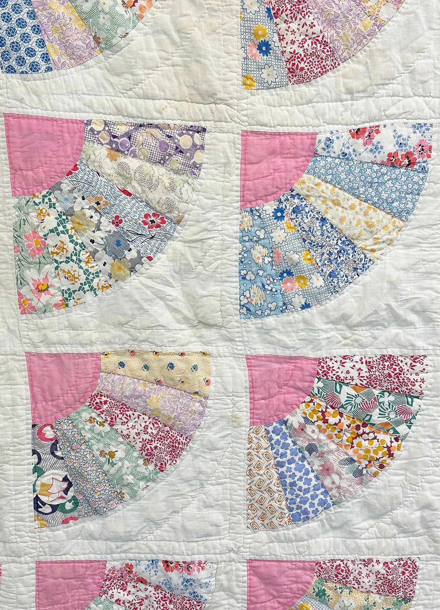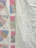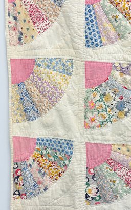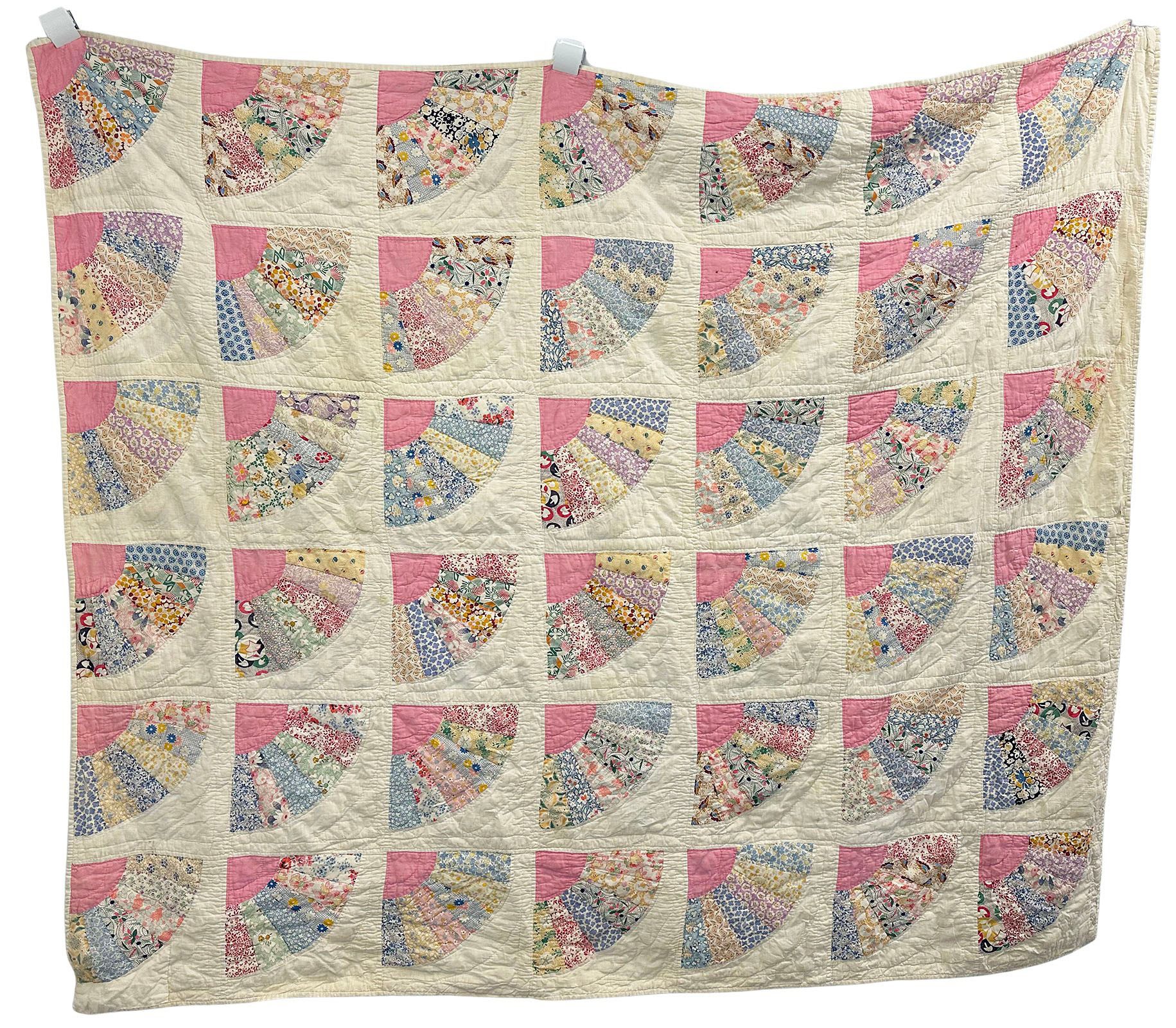 Vintage Handmade Fan Quilt. Approximate Measurements: 60" x 65" (5ft x 5ft 5in). In good condition with some dirt spots.