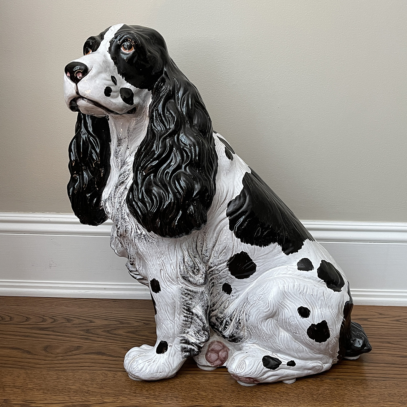 Life Size Vintage Italian Midcentury Black And White Terracotta Spaniel Dog Sculpture. Gazing upwards like the excellent dogs spaniels are. Beautifully realistic, excellent decor piece.