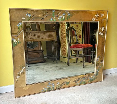 Vintage LaBarge Eglomise Chinoiserie Wall Mirror. With a beveled mirror. Well Made and in Very Good Condition. 51" x 41.5"
