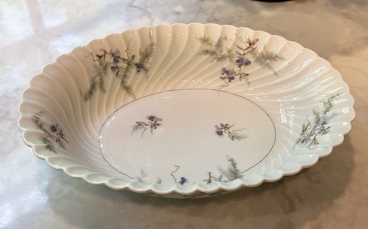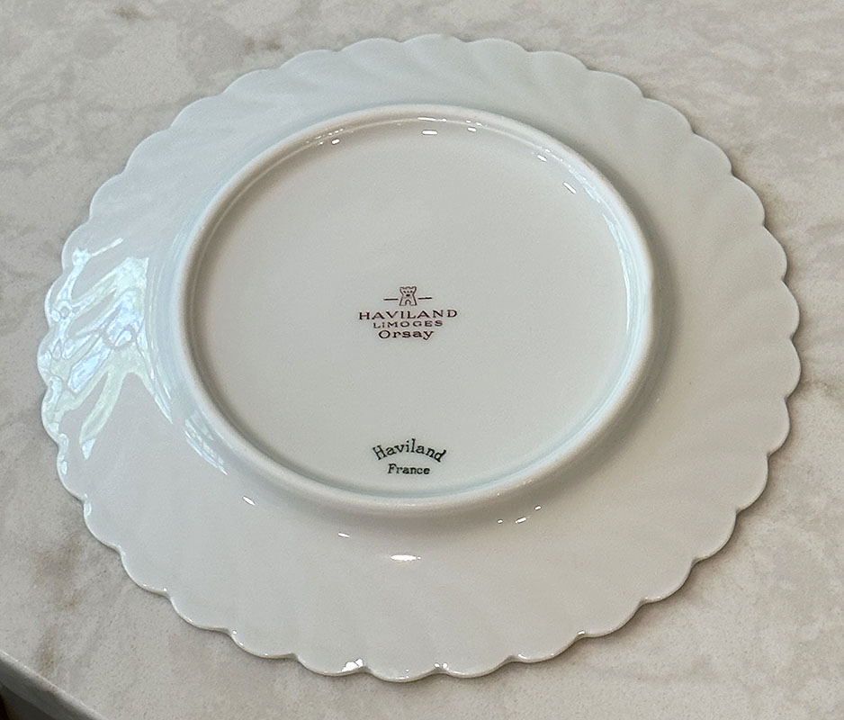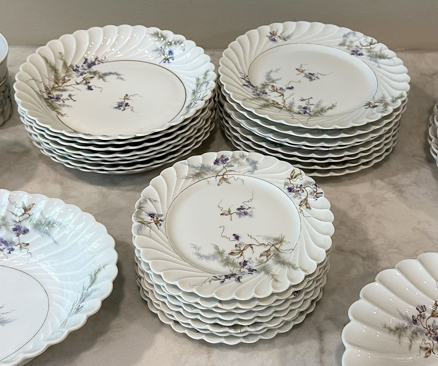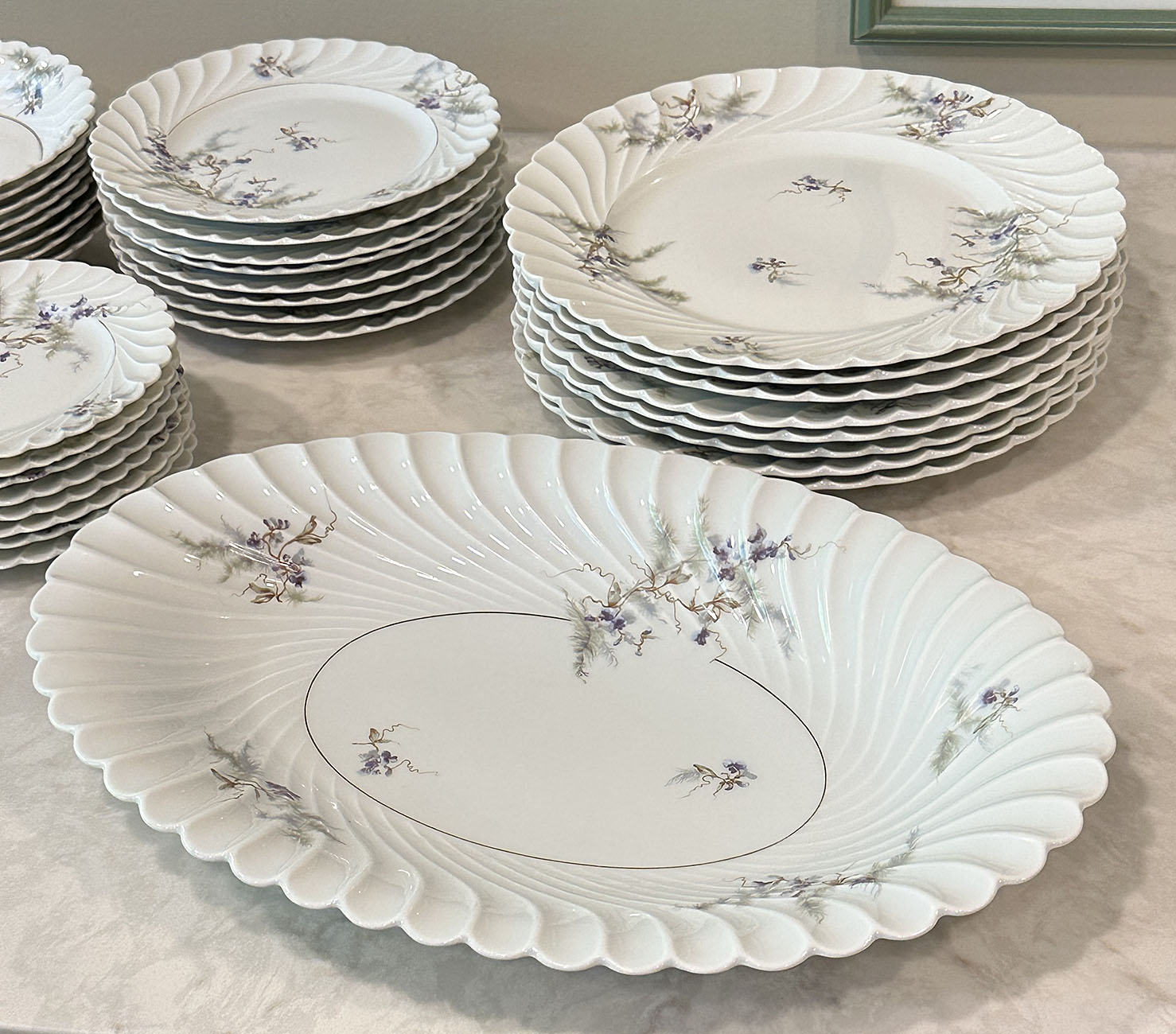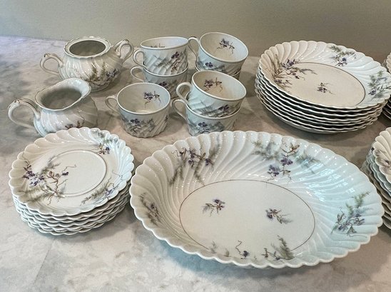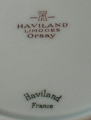 Vintage Limoges Haviland Orsay pattern China Set. 49 Pieces. Circa 1950's. This set includes 8 Dinner Plates, 8 Salad Plates, 8 Bread Plates, 8 Soup Bowls, 7 Cups & Saucers, a 15.5" x 10.5" Serving Platter, a 10.5" x 7.25" Serving Bowl, Creamer, and a sugar bowl (no lid). In Very Good Condition.
