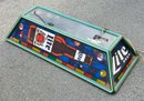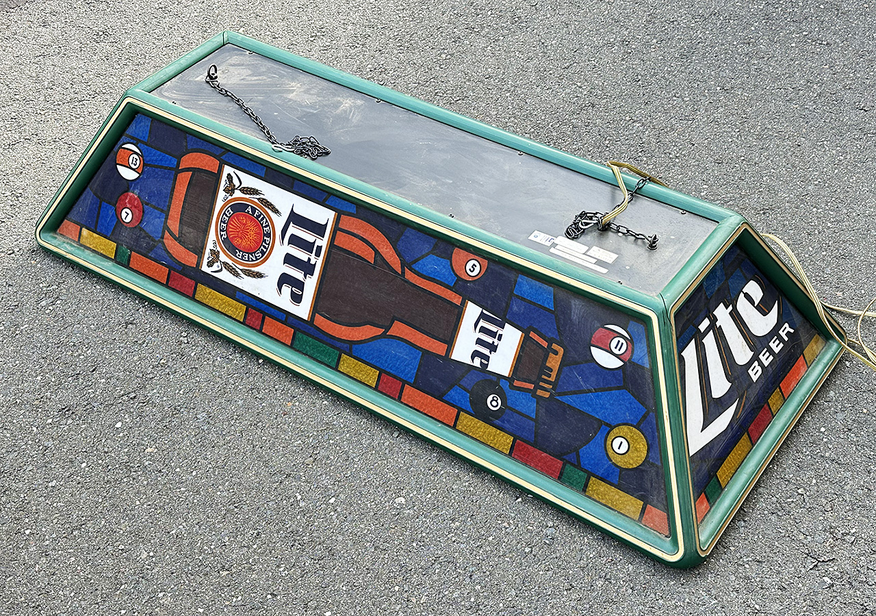 Vintage Lite Beer Stained Glass Style Billiard Table Light. Plastic construction. From 1992. 47" x 20" x 11"h. In good condition with some cracking/splitting on the edges and browning on the interior. Needs a light bulb.