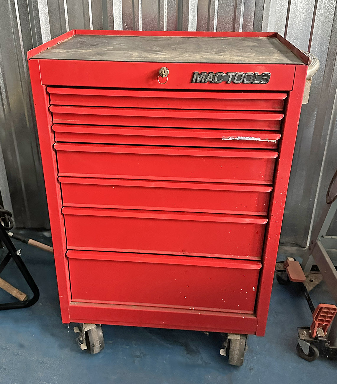 Vintage Mac Tools 7-Drawer Rolling Tool Box. Locking (with key). 35"w x 18"d x 41"h. In Good Condition.