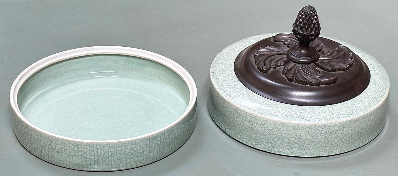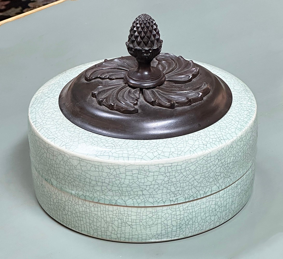 Vintage Maitland Smith Chinoiserie Porcelain Celadon Lidded Trinket Dish. Maitland Smith round lidded trinket dish/box with a factory distressed pale celadon green glaze, topped with a bronze pineapple shaped finial. In Very Good Condition. 10" in diameter, 8" tall.