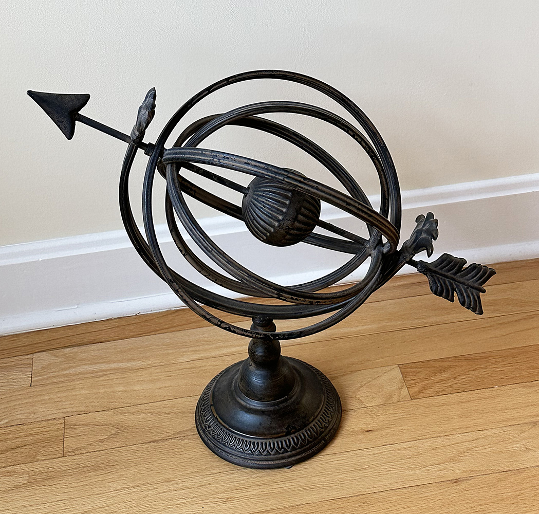 Vintage Metal Armillary Globe With Arrow. 16" tall and 18" wide. In Very Good Condition.