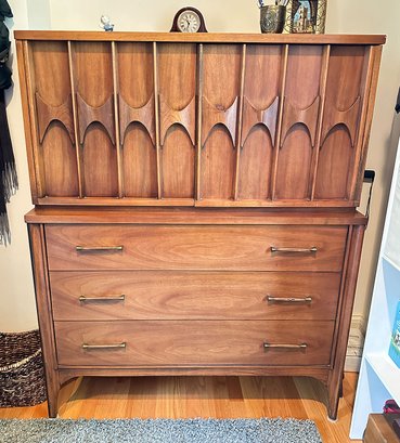 Vintage Mid-Century Modern Kent Coffey Perspecta Gentlemans Chest. In Walnut. Very desirable piece. With Brutalist detail on the top shelf doors. 40.75"w x 19.25"d x 52"h.