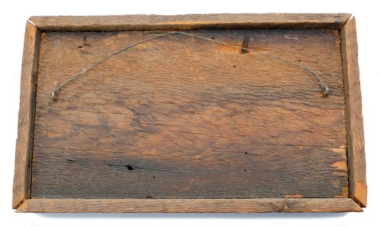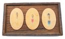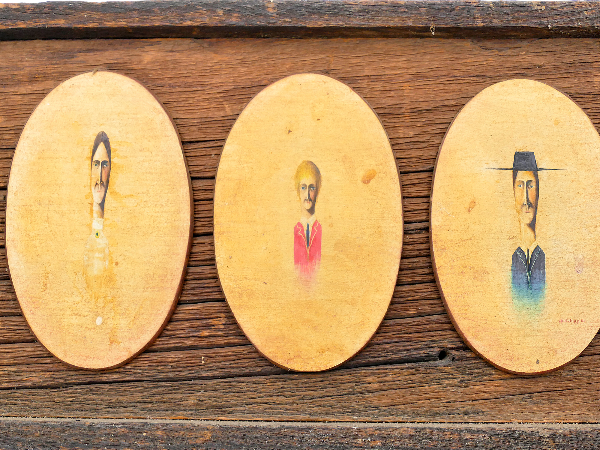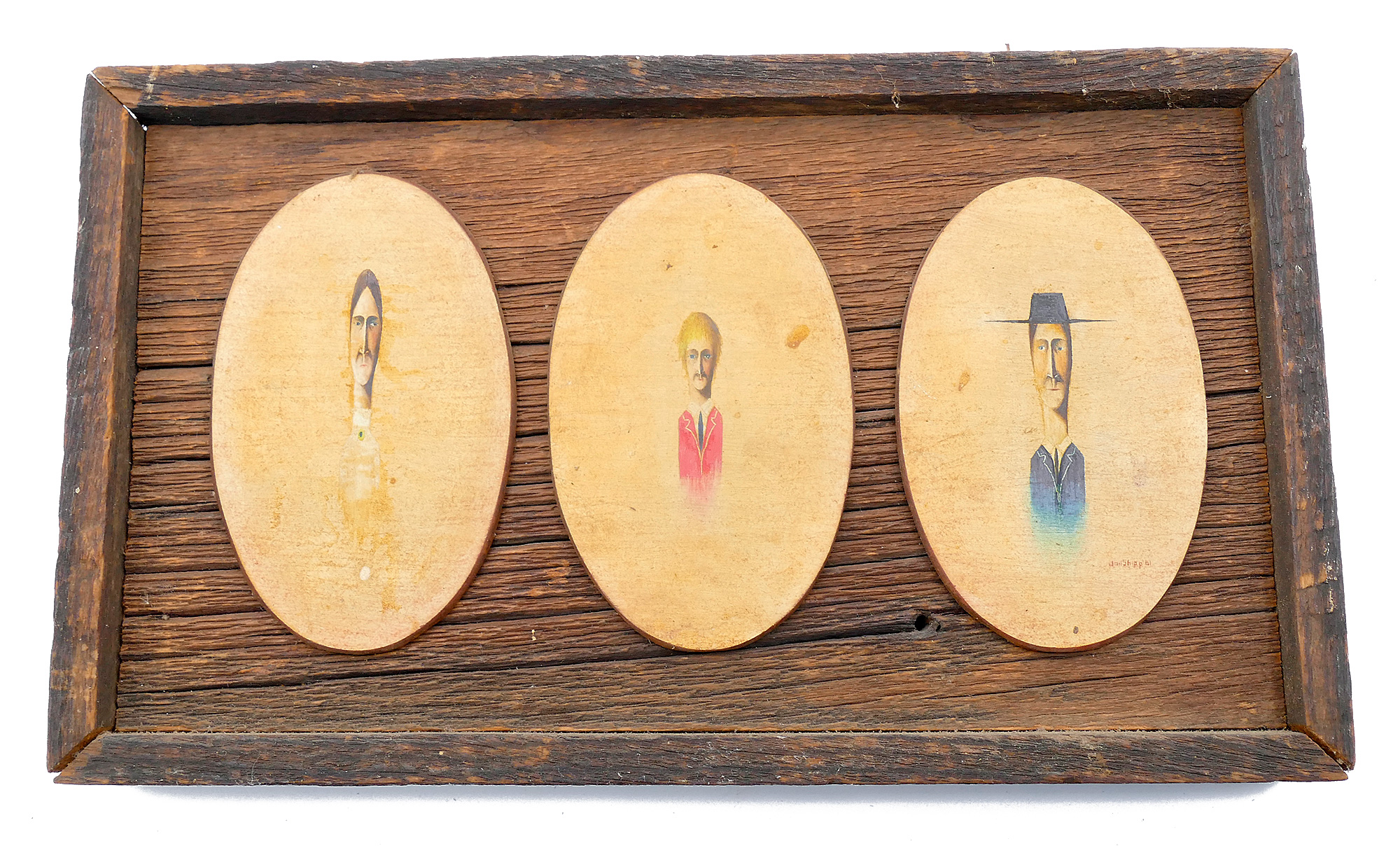 Vintage Mid Century Modern Wood Original Miniature Paintings By Jon Shipp (1961). Three oval miniatures mounted to a custom distressed wood frame. 6" x 10.25" (frame). In Very Good Condition.
