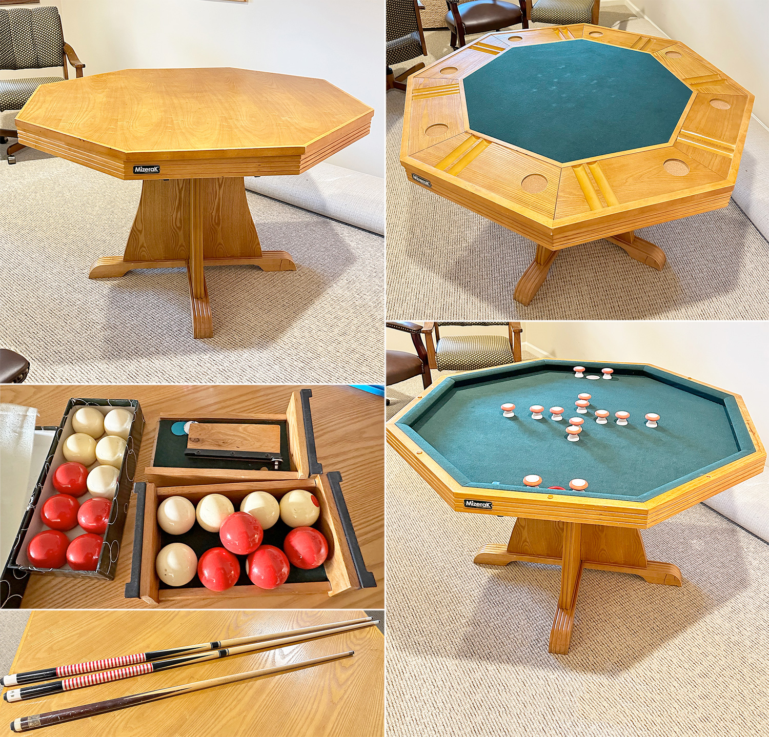Vintage Mizerak 3 in 1 Game Table - Bumper Pool, Poker, and Flat Top For Games. Wood and felt construction. Includes bumper pool balls, brush, 2 regular pool cues, and a rescue cue. In good overall condition with some light wear. Well maintained. 48" x 48" x 30"h.