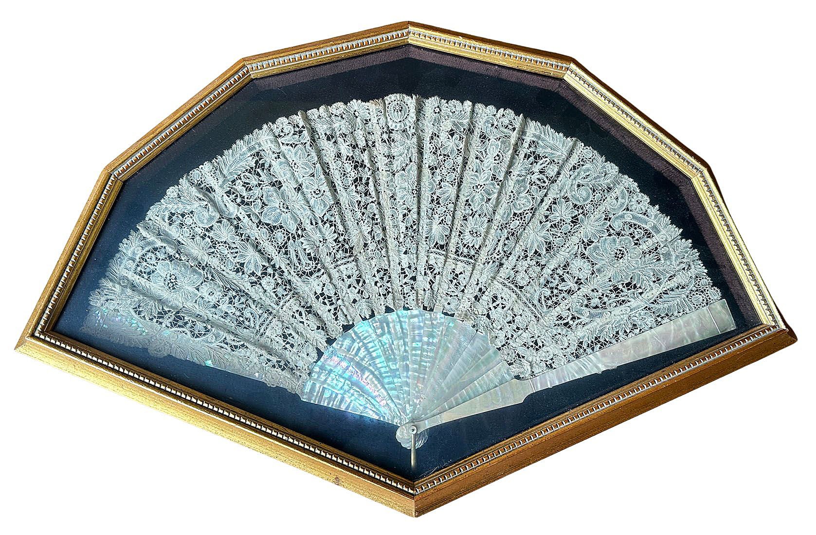 Vintage Mother of Pearl and Floral Lace Hand Fan. In a custom shadow box. 25"w x 16" (frame). In Good Condition.