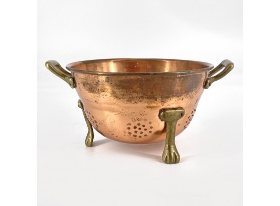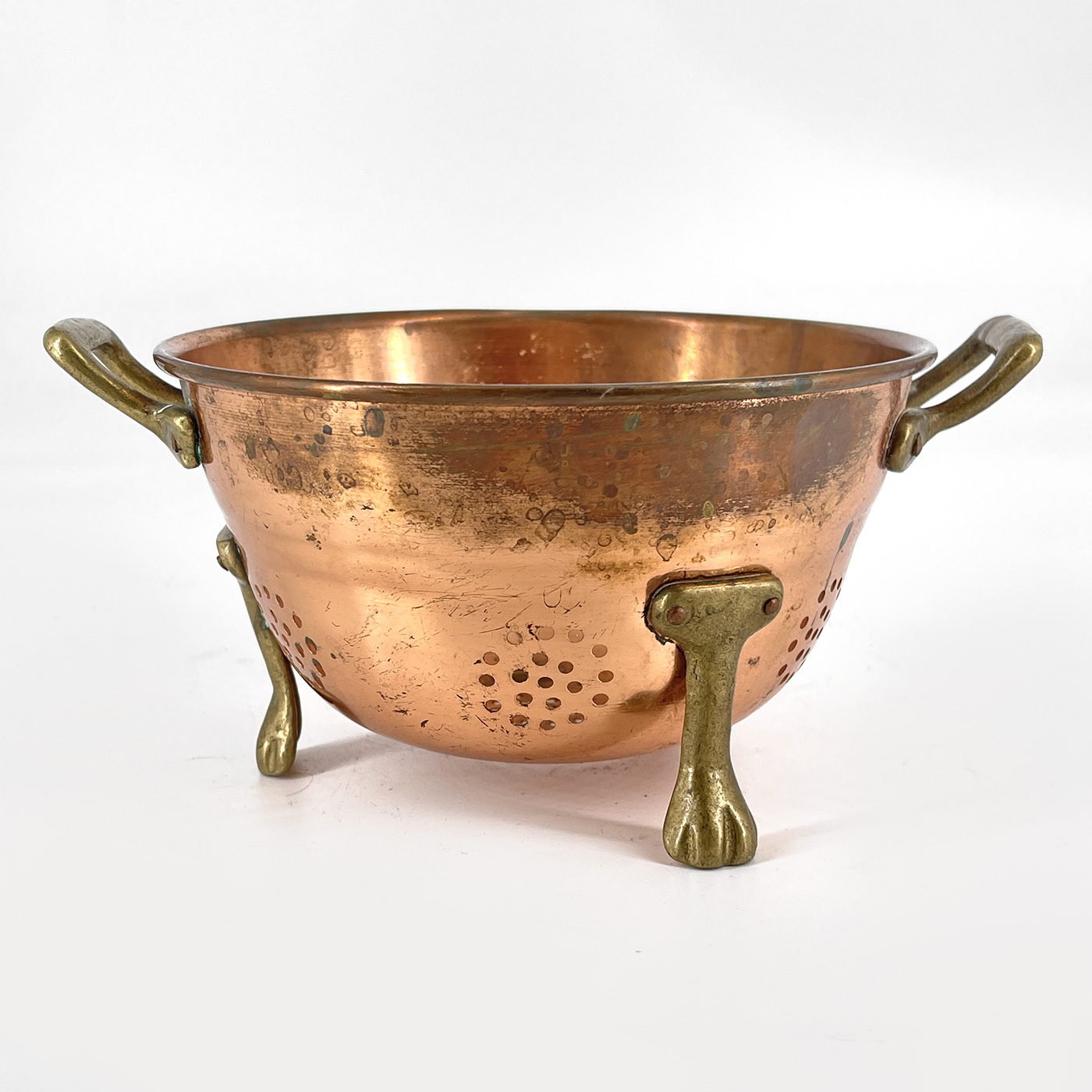 Vintage ODI Korea Small Copper Colander / Strainer with Brass Feet. Overall wear from age and use.