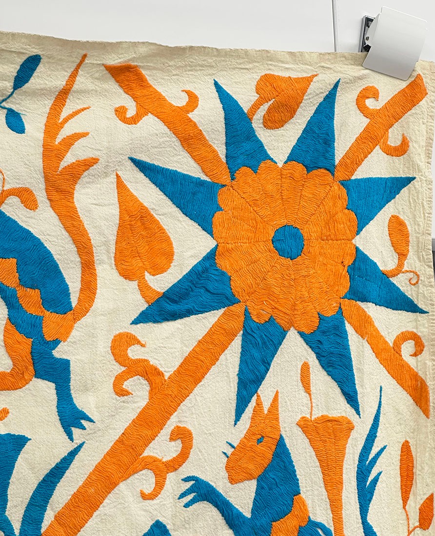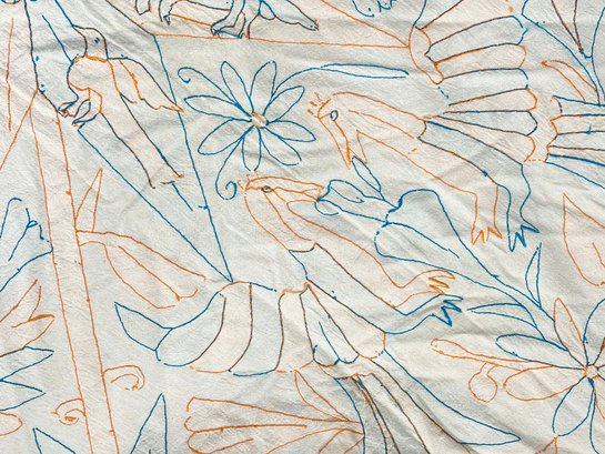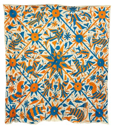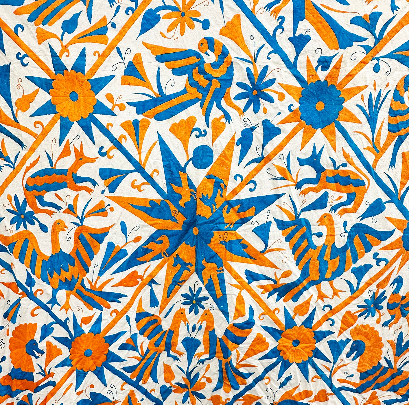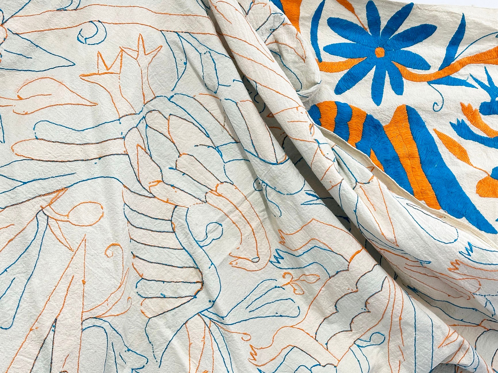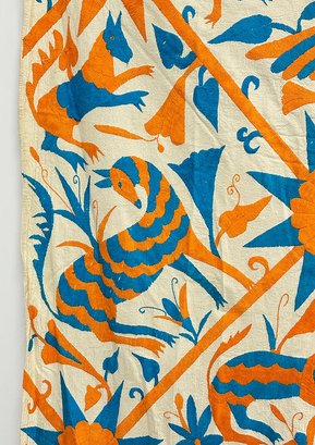 Vintage Otomi Hand-Embroidered Tapestry - Mexican Folk Art. Approximately Measurements: 64" X 72" (5ft 4in X 6ft). In good condition with some wear and dirt spots.