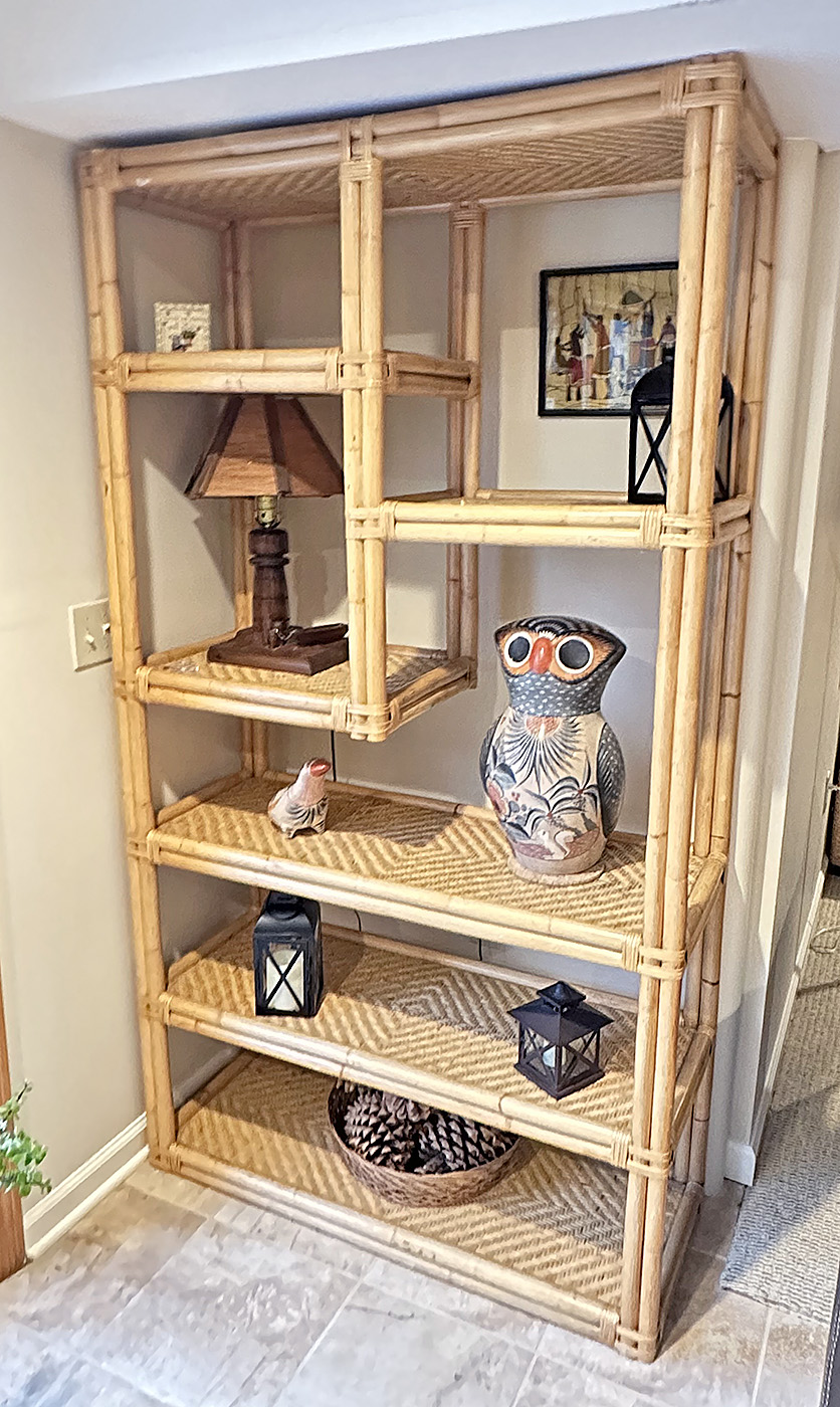Vintage Rattan Bamboo Etagere Bookcase. 76" Tall, 42" Wide, 16" Deep. In good condition with some wear and staining.