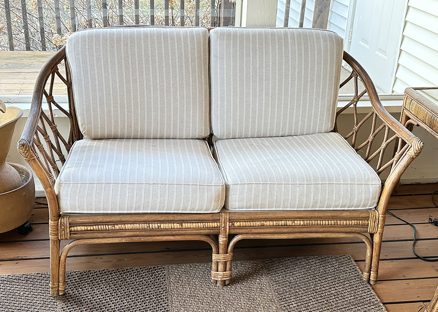 Vintage Rattan Loveseat Sofa. 55" wide. With upholstered cushions. In Good condition. 55" x 32"d x 34"h