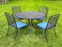 Vintage Russell Woodard Wrought Iron Patio Dining Set. Circa 1950's-1970's. 48" diameter table, 29" tall. Includes a round dining table and 4 chairs. Includes cushions with Sunbrella fabric. This set was recently powder coated a couple season ago and is in Excellent Condition. These are great examples. Measurements: 48" diameter, 29"h (table), 19"w x 21"d x 36"h (chair)