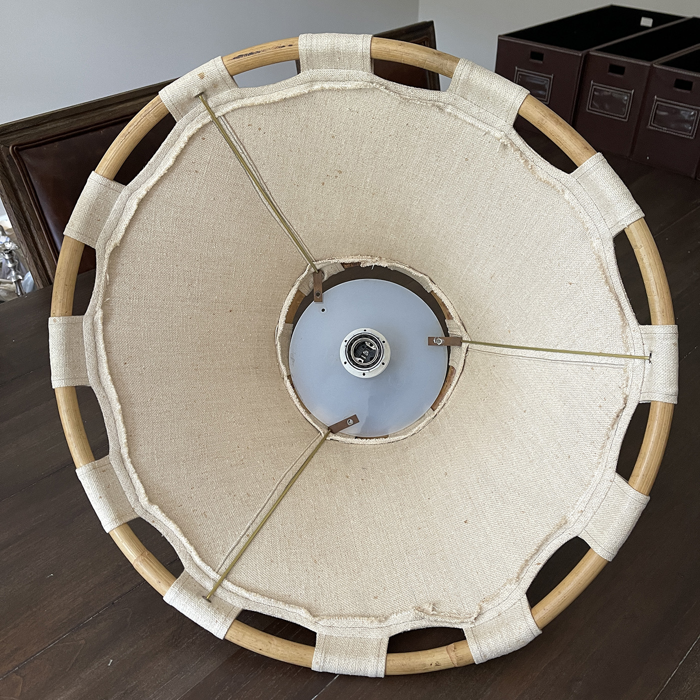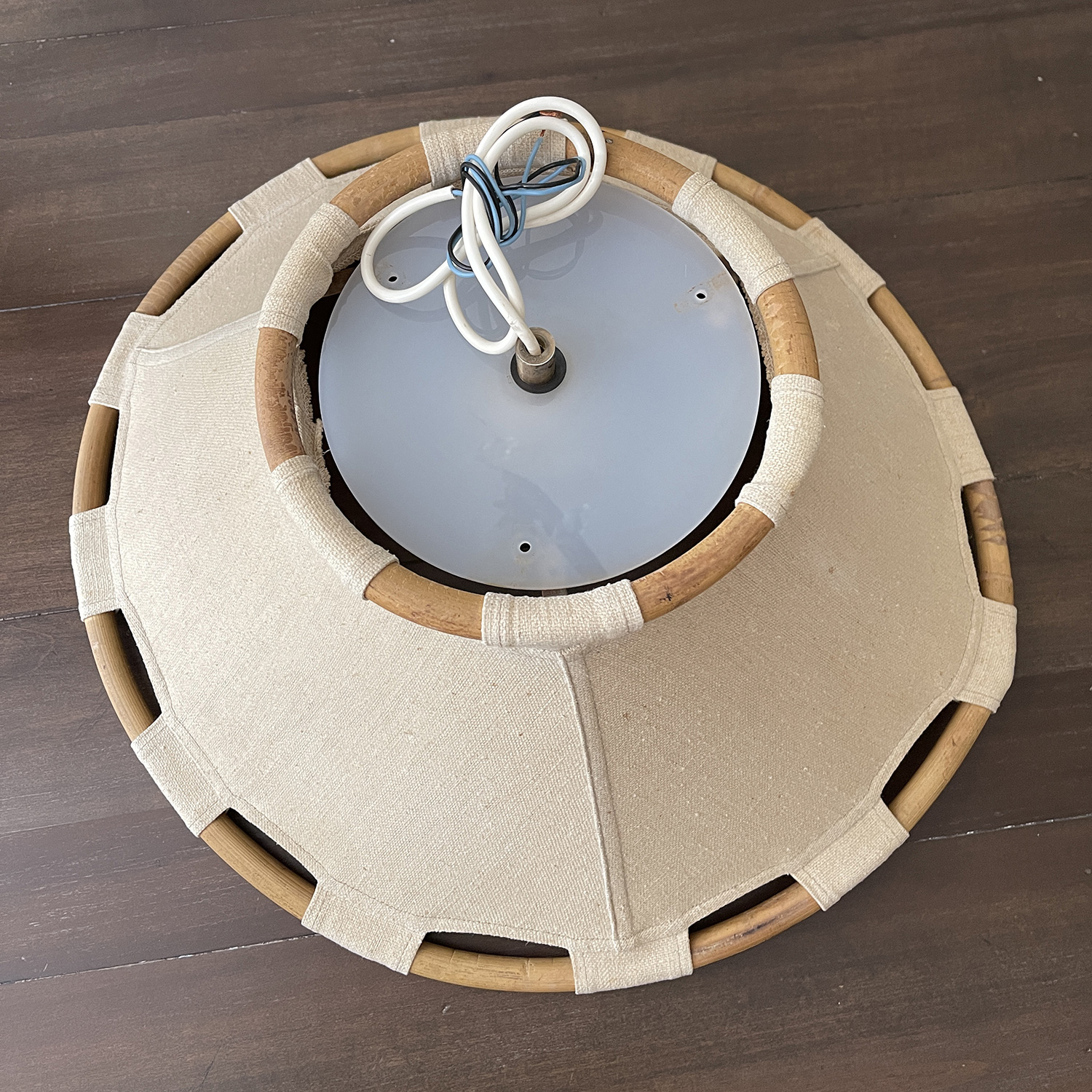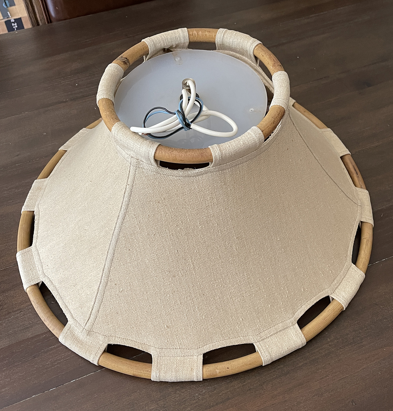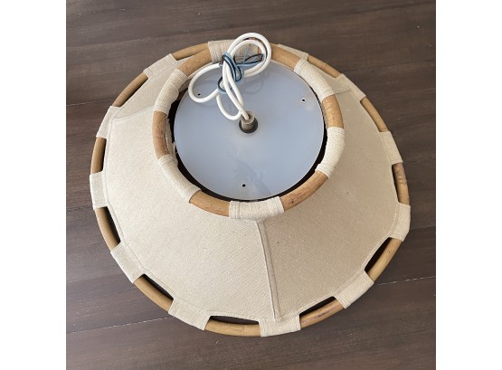 Measurements: 22" diameter. Untested. The frame and shade appear to be in Very Good Condition. The screws to the top are missing but can easily be replaced. Untested.
