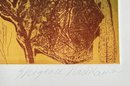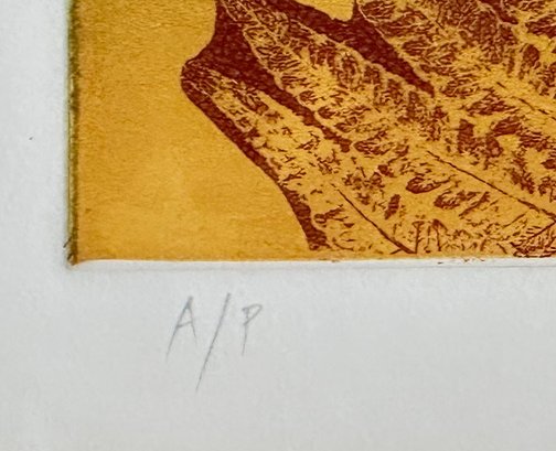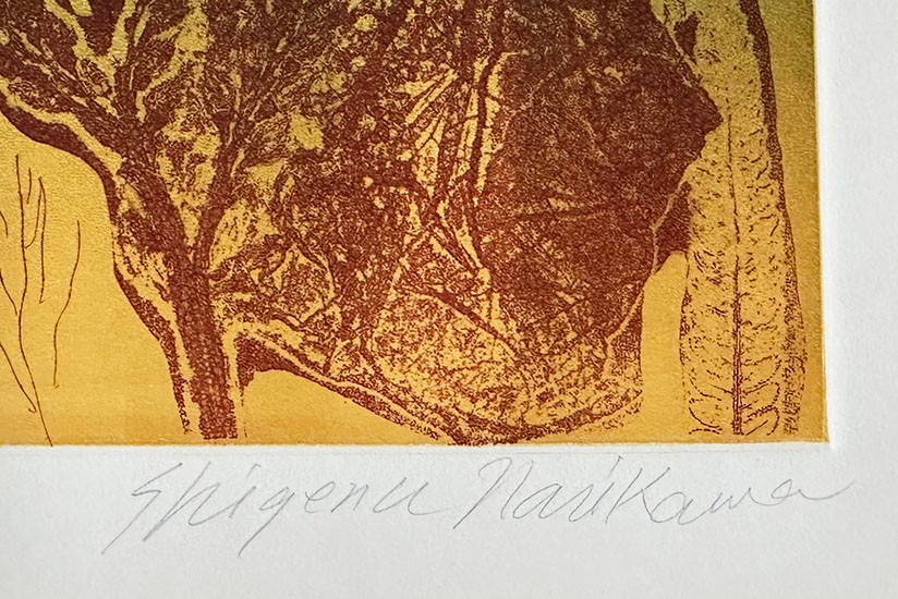Shigeru Narikawa (Japan, B. 1946) Aquatint Etching "Evening Sun". Circa 1970's. Signed and Titled in pencil by the artist. Artist's Proof. In good condition; paper edges has some creases but will not be seen once framed. Great Colors. Measurements: 22" x 28.75" (paper)