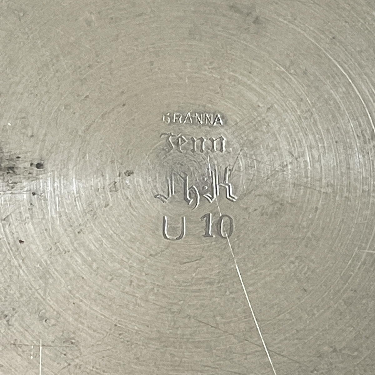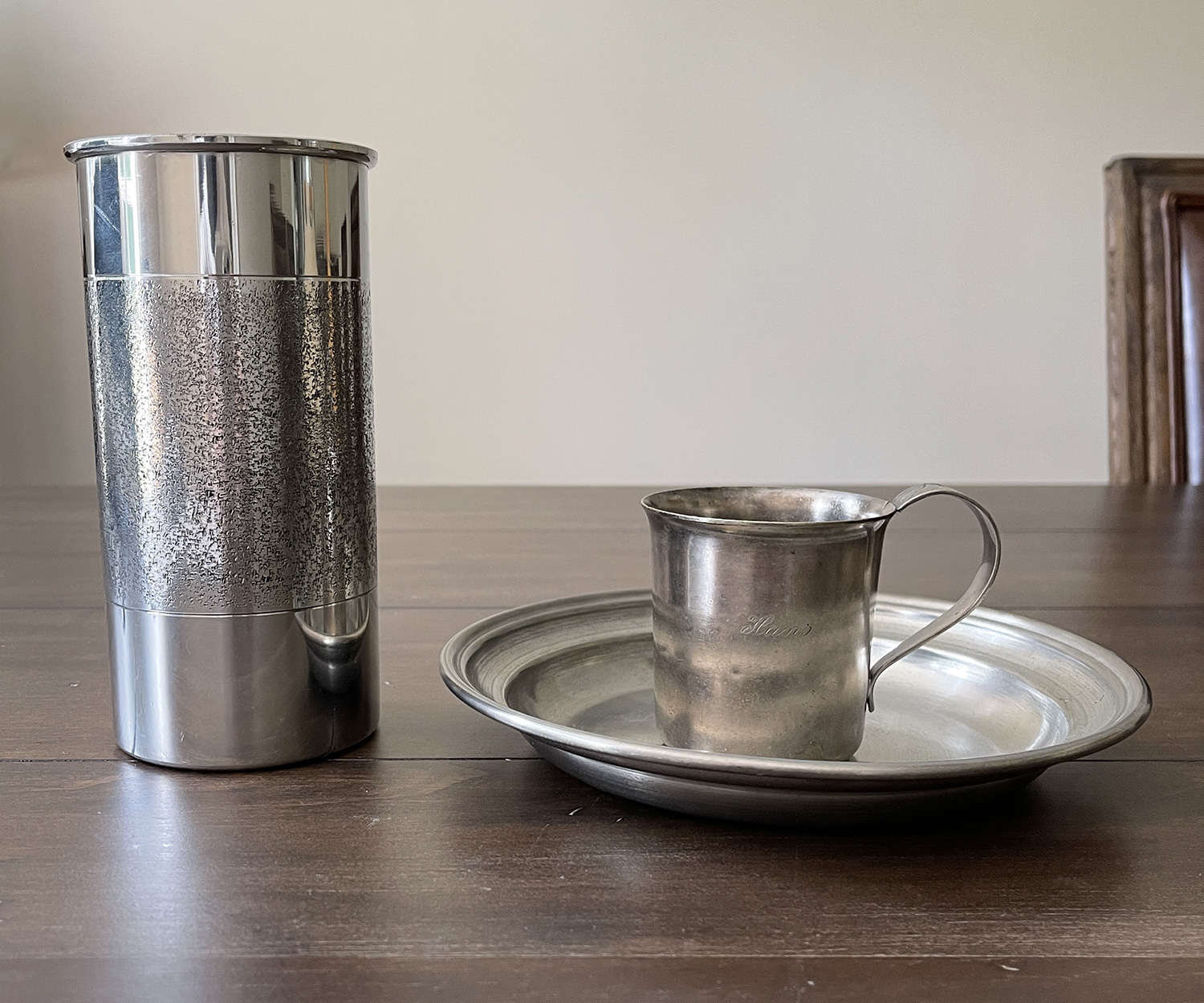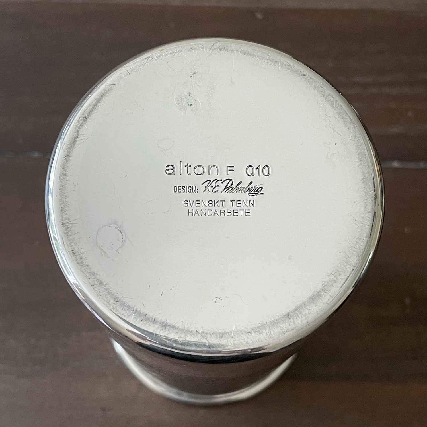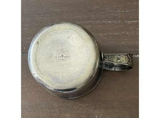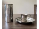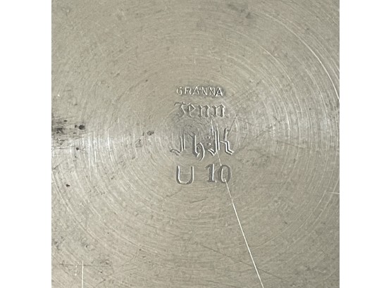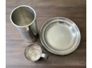 Vintage Swedish Pewter/Silverplate Lot - Includes a Svensk Tenn Alton K.E. Palmberg Pewter Cup/Vase (6.75"h x 3"), Gränna Tenn 8" Pewter Plate, and a GAB silverplate 3" cup. All In Very Good Condition.
