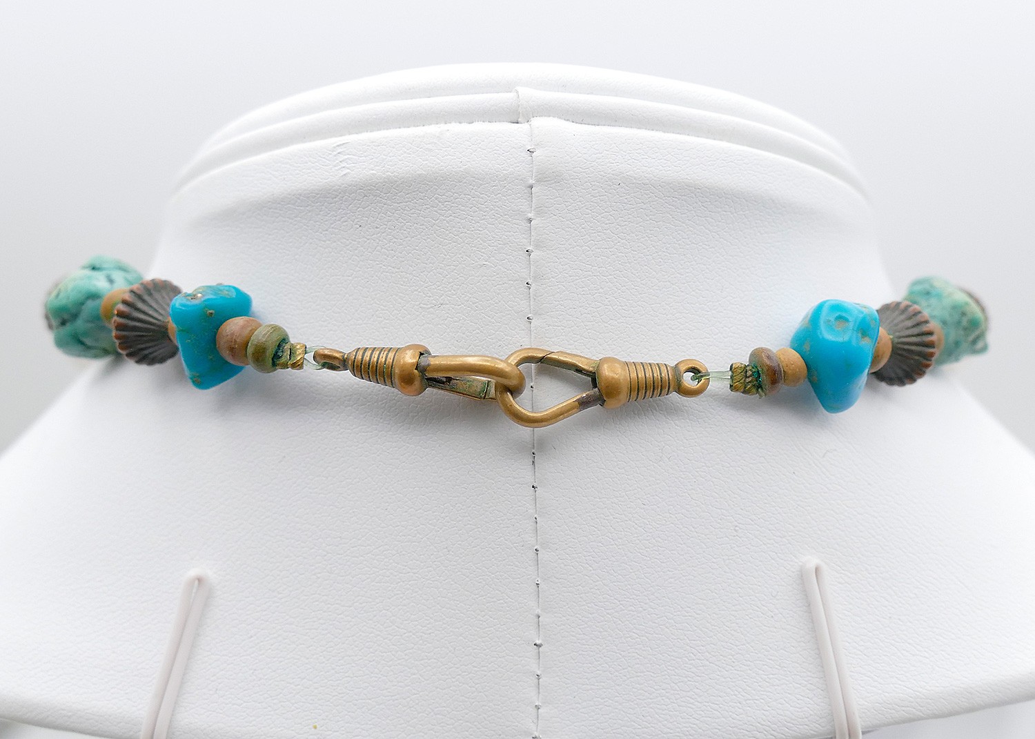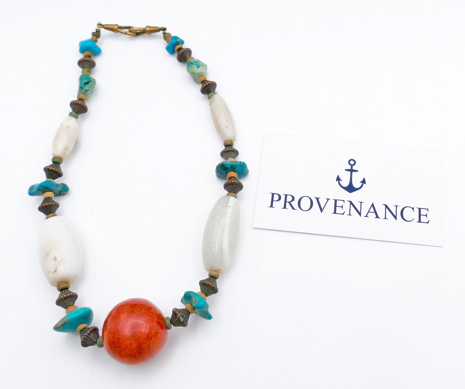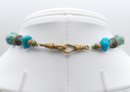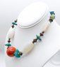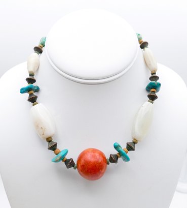 Vintage Turquoise, Coral, And Stone Necklace. 16" long, 1" round coral center. In Very Good Condition.