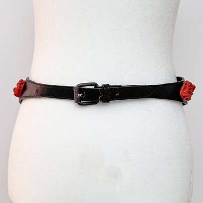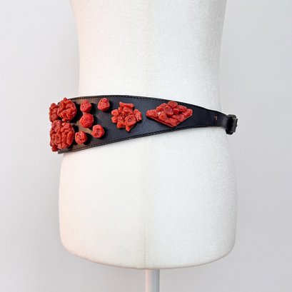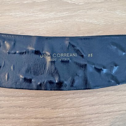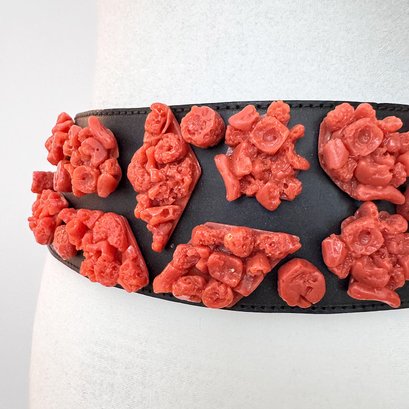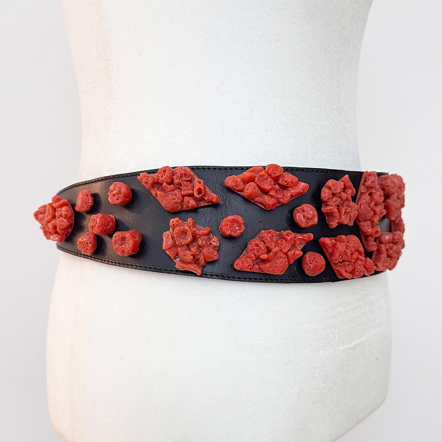 Vintage Ugo Correani Belt. Leather and faux coral. Made In Italy - Sz 85/S (32-34 waist). Some wear and cracking to the belt in the back and closure area but still buckles fine. Ugo Correani did a lot of designs for both his company and for designers like Gianni Versace.