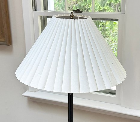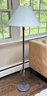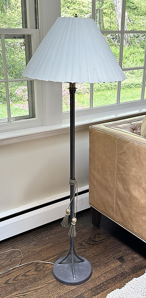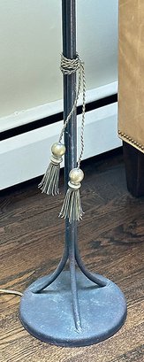 Vintage Wrought Iron With Metal Tassels Floor Lamp. The lamp is in good condition with some aging and the shade has some denting and fraying. 60" tall, 20" diameter shade.