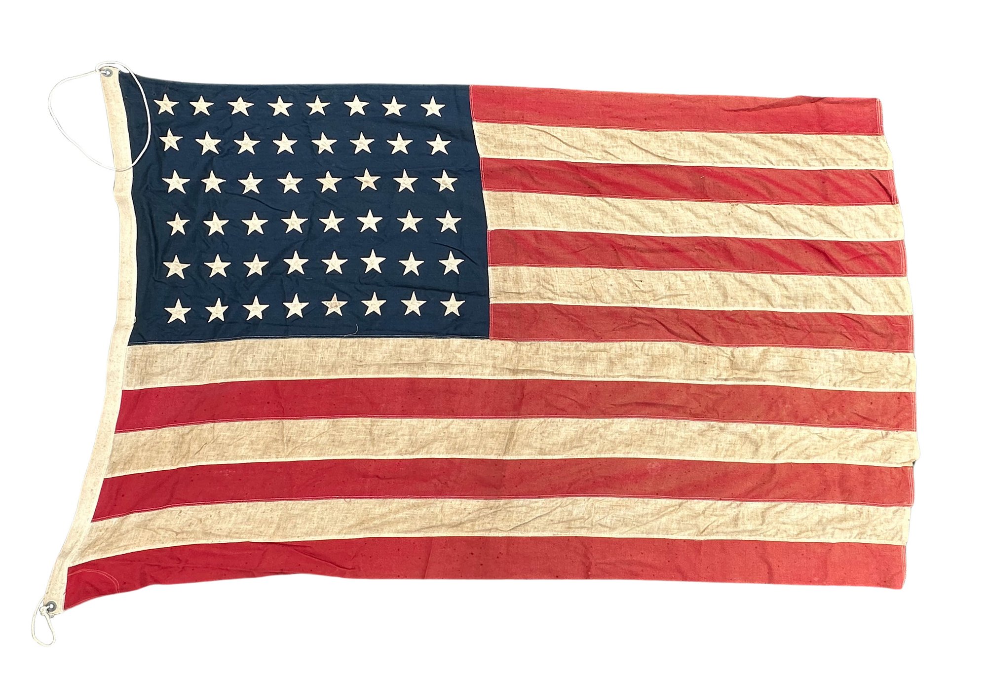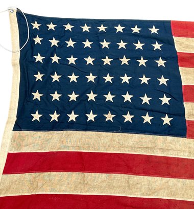 Vintage WWII Period US 48-Star Flag. Approximate Dimensions: 69" x 43" (5'9" x 3'7"). In Good, Vintage condition with some wear and tear from use and age.