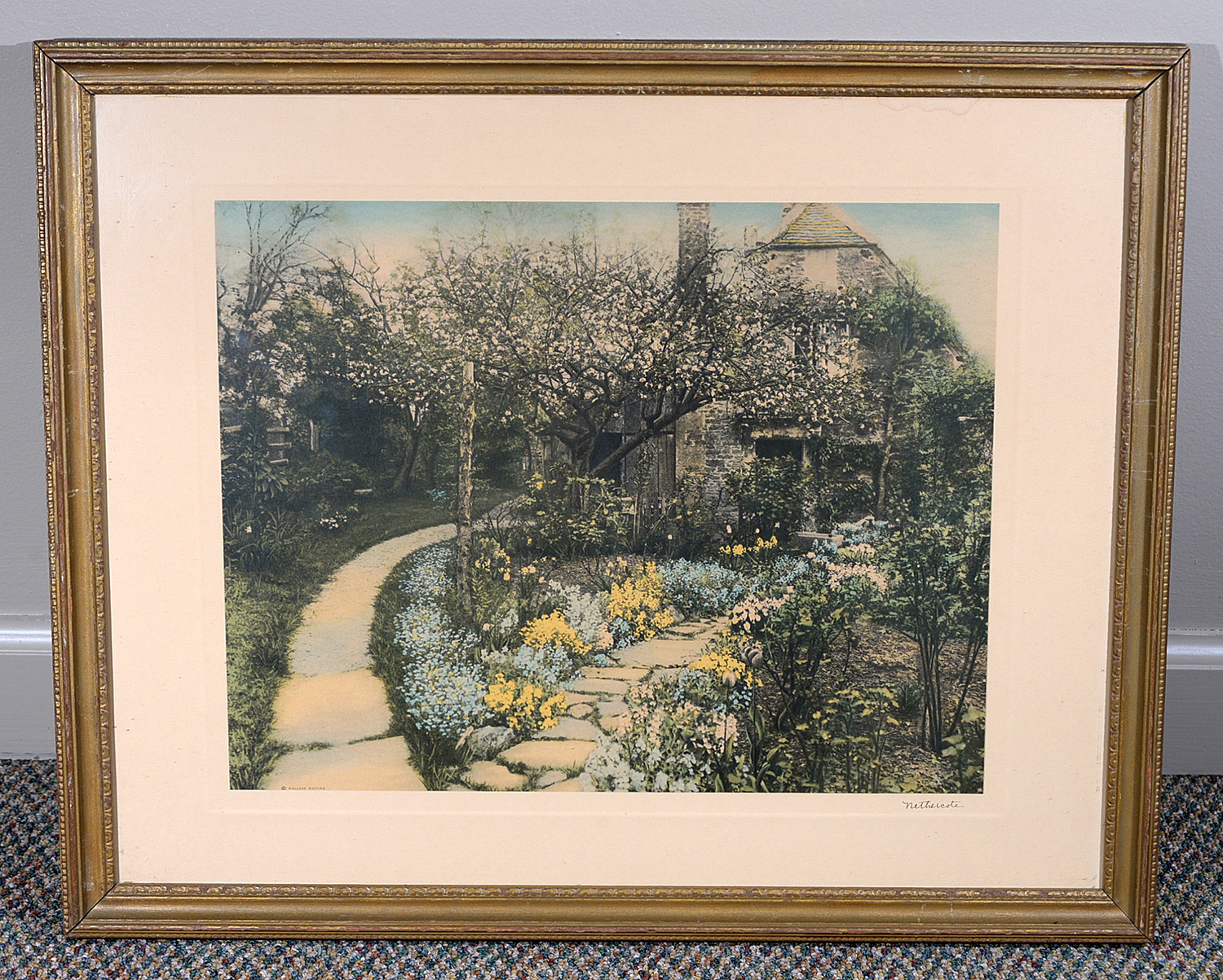 Wallace Nutting Hand Colored Photo "Nethercote". Circa 1920s-30s. Hand Titled In Pen. Measurements: 17.5" x 21.5" (frame).