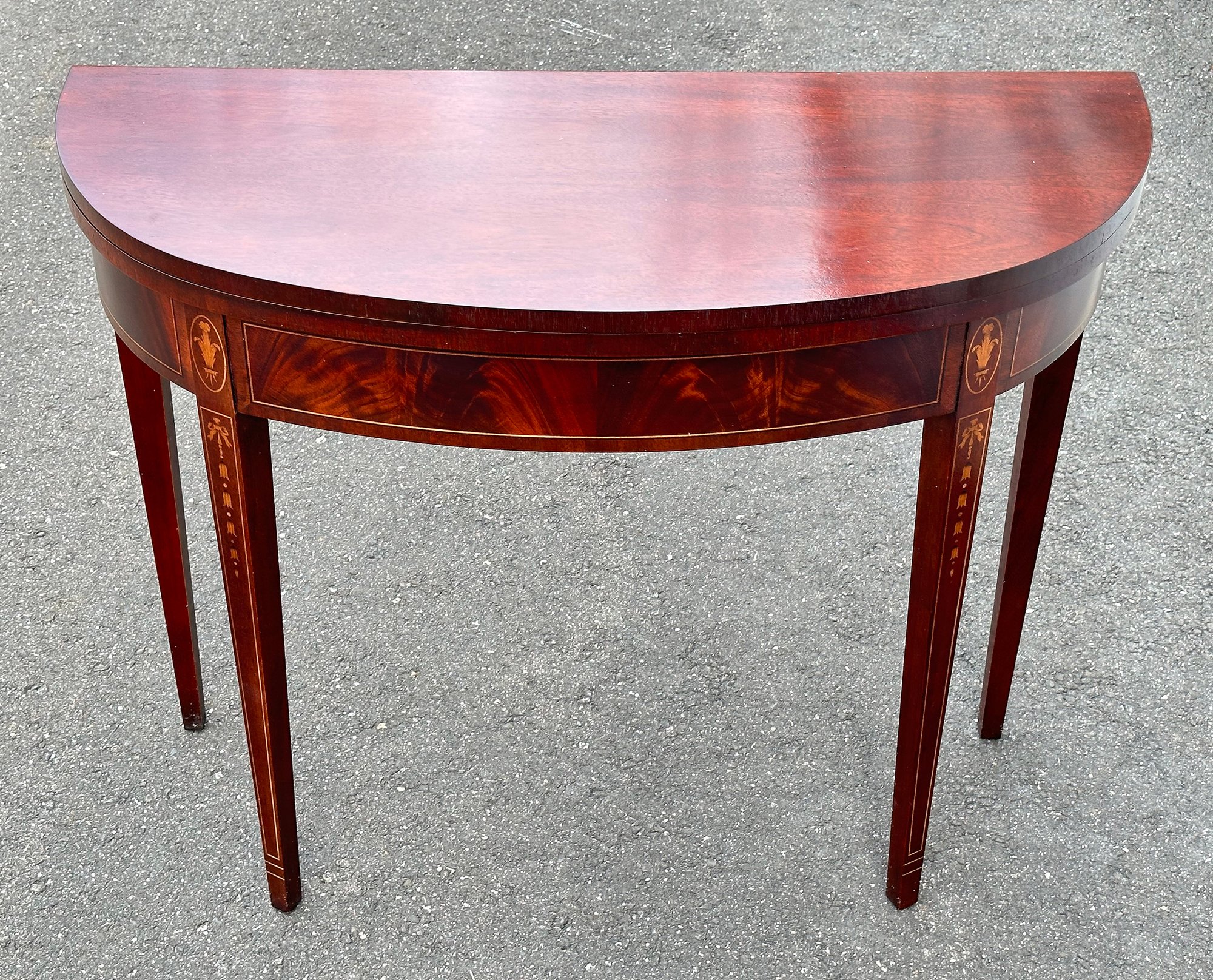 Wellington Hall Mahogany George III Style Demi Lune Console / Card Table. 35"w x 14"d x 30"h closed as a console table and opens to 35" x 28" x 28.5" as a full/card table. In Good Overall Condition with minor wear and marks.